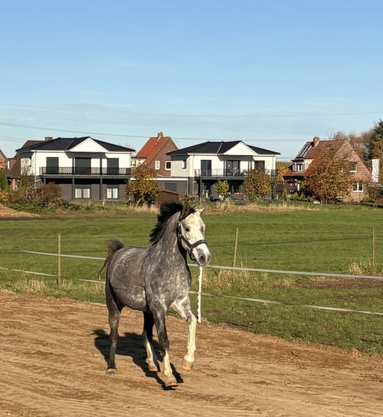 Zum Verkauf steht ein deutsches Reitpony, geboren 2020 mit einem Stockmaß von 1,51 m mit viel Ausdruck. Dieses Pony steht derzeit im Offenstall, kennt aber auch die Box. Diese wird ihm mit rationiertem Futter auch besser bekommen. Er braucht einen Reiter, der ihm Sicherheit gibt. In allen drei Grundgangarten lässt er sich flüssig und harmonisch reiten, sucht die Anlehnung an die Hand und vermittelt dabei ein angenehmes Reitgefühl. Ein lernwilliges und kluges junges Sportpony, welches weiter gefördert werden will. Nur bei ernsthaften Interesse melden. Für jedes Probereiten werden 20 € berechnet.
