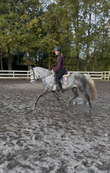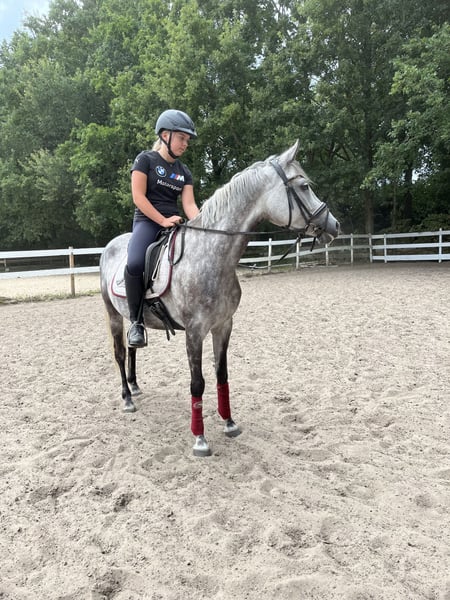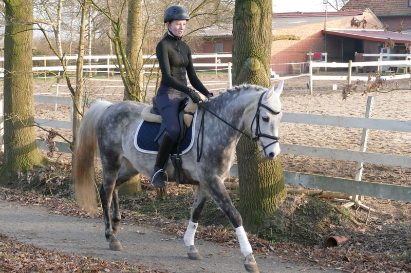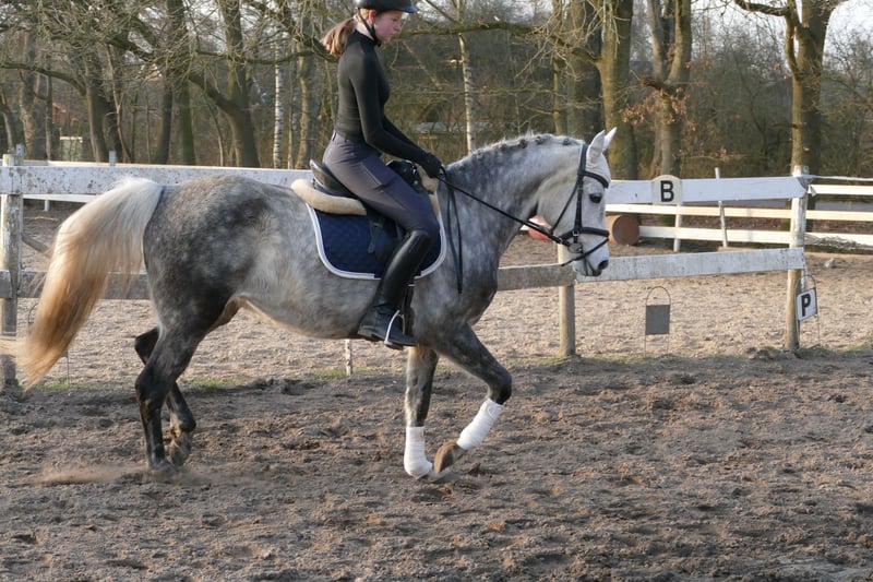 Susi est une jolie ponette de selle, équipée de trois allures de base très agréables. Elle a été monté tardivement, ce qui signifie qu’elle doit encore être davantage dressée. Chez nous, elle est monté par des jeunes cavaliers et se laisse monter calmement dans ses trois allures fondamentales. Elle a une bonne locomotion naturelle, ce qui la rend inadaptée aux débutants. Elle a également déjà effectué plusieurs sorties en extérieur très calmement et en prend beaucoup de plaisir. En manège, elle est toujours calme et obéissante. Avec une formation supplémentaire, je pourrais également l’envisager comme poney de concours, car elle possède un potentiel pour la dressage comme pour le saut.
