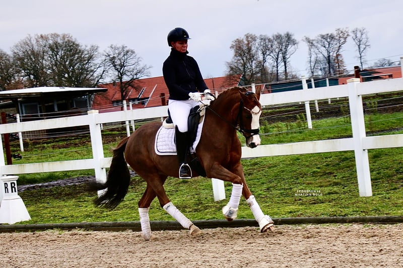 | Werbung | | DR | Stute | Fuchs | *2014 | 144 cm | v. Golden State x Dressman „Goldstück“ ist eine bildschön aufgemachte Stute, die neben ihrer Optik auch mit drei guten Grundgangarten überzeugen kann. Dies konnte „Goldstück“ bereits bei ihren Turnierstarts unter Beweis stellen. Ihre letzten Prüfungen schloss sie mit ihrer 11-jährigen Reiterin mit 8 und 8,1 in A-und L-Dressur ab. „Goldstück“ wurde turniermässig wenig eingesetzt, da sie als Lehrpony für ihre noch sehr junge Reiterin gekauft wurde und diese erst im heimatlichen Stall das Reiten auf ihrem Pony erlernen sollte. „Goldstück“ war die perfekte Lehrmeisterin, so dass ihre Reiterin bereits 12-jährig erfolgreich in den gehobenen FEI-Sport einsteigen konnte. Die Stute hat eine tolle Größe für kleinere Reiter, sie deckt aber auch kleinere Erwachsene problemlos ab. Neben der sportlichen Karriere, ist die Stute auch züchterisch sehr interessant und konnte bereits ein sehr schönes Fohlen bringen. „Goldstück“ sucht nun einen neuen kleinen Reiter, dem sie wieder zum Einstieg in den Reitsport verhelfen kann. Die Stute ist auf dem Video nicht beschlagen. Ein röntgonologischer Tüv incl. Rückenbildern von 2025 liegt vor. https://youtu.be/_v2IDxajaHE?si=5-A6cokHZqam1wI5 Bei ernsthaftem Interesse melden Sie sich gerne telefonisch unter der +491707941333.