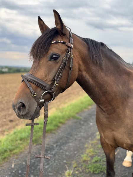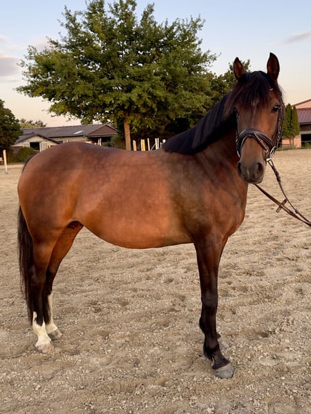 Unridden, unused riding pony mare by Novalis T x Going East. After a successful breeding career producing many good offspring since last spring, she has recently returned to training and is immediately ready for riding. Current videos are available and can be gladly sent upon request. Born in 2011 and standing at 1.45 meters, she covers very well. Equipped with a lot of go and very responsive to aids, the mare has three excellent gaits and makes a good jump. Always well-behaved in handling, she is comfortable riding alone or in a group, both in the arena and on the trail. She is familiar with open stable management, including overnight box stall with daytime turnout in paddocks and pastures. For calls and videos, please contact 0176-70317184.