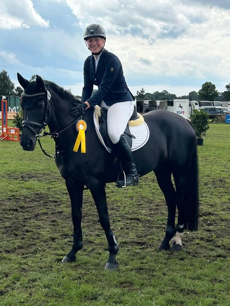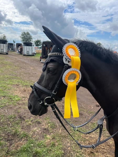 Penny ist eine sehr hübsche und ausdrucksstarke Rappstute im Endmaß – sehr gut abdeckend auch für größere Reiter interessant. Sie ist ein sehr lauffreudiges und leistungsbereites Pony mit gutem Charakter und körperlicher Kraft. Sie war bereits 6jährig bei den Springponys in Warendorf Vize-Bundeschampion. Leider ist sie danach nicht in fachmännische Hände verkauft worden und hatte bald keine Freude mehr am Springen. Zu diesem Zeitpunkt habe ich sie gekauft und dressurmäßig weiter gefördert, sodass sie jetzt in der Dressur bis zu Lektionen der Klasse S ausgebildet ist. In den letzten Jahren ist sie wieder auf Turnieren in A-Springen platziert und mehrfach siegreich gewesen. Durch ihre früheren schlechten Erfahrungen und ihre Sportbegeisterung ist sie kein Pony für Anfänger. Bei Interesse können Sie mich gerne unter 01525-1786192 anrufen.