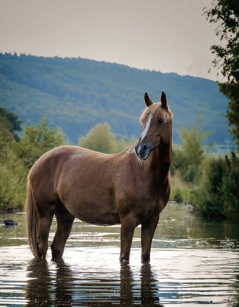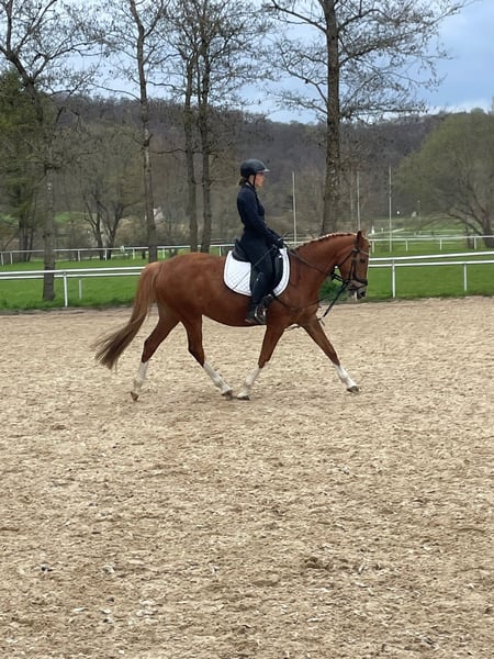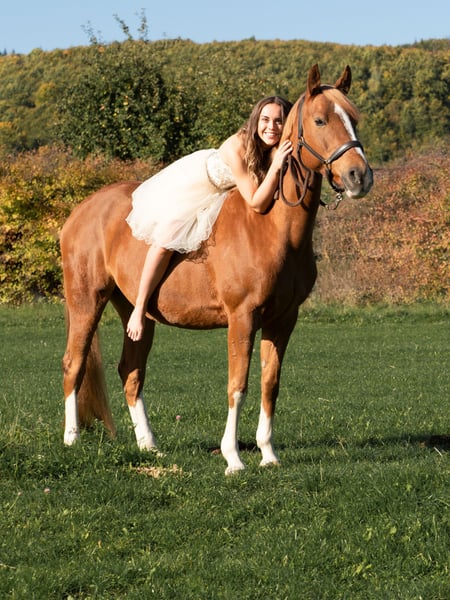 Braves Endmaß-Pony mit Herz und Verstand! Zum Verkauf steht ein ausgesprochen zuverlässiges und gut erzogenes Endmaß-Pony, das mit seinem ausgeglichenen Wesen und seiner angenehmen Art sowohl im Alltag als auch im Training überzeugt. Meine Fuchsstute Lorelei (15 Jahre) sucht ein neues Traum zu Hause. Mit ihren 4 weißen Beinchen und blonder Mähne, sowie 3 tollen GGA überzeugt sie optisch in jeder Hinsicht. Aber auch charakterlich lässt sie keine Wünsche offen. Sie ist total unerschrocken, brav im Umgang, äußerst gutmütig - daher auch für Anfänger geeignet, da sie auch Fehler verzeiht. Treten, steigen, beißen sind für sie kein Begriff. Sie ist eine echte Lebensversicherung und war auch damals für mich als Neueinsteiger in den Reitsport ein wahrer Lehrmeister. Sie lief in der Vergangenheit sowohl Dressur A/L Niveau als auch Vielseitigkeit, daher geht sie auch total brav ins Gelände - ob alleine oder in der Gruppe. Lore läuft Barhuf und ist verladefromm. Sowohl Hufschmied, Laufband als auch Hänger fahren ist für sie kein Problem. Lore ist eher rangniedrig und kennt sowohl Boxenhaltung, als auch tagsüber (in einer 8-köpfigen Herde) Offenstallhaltung mit täglichem Koppelgang. **Bei ernsthaftem Interesse** freuen wir uns über eine Nachricht. Videos und Probereiten nach Absprache möglich. Platz vor Preis!