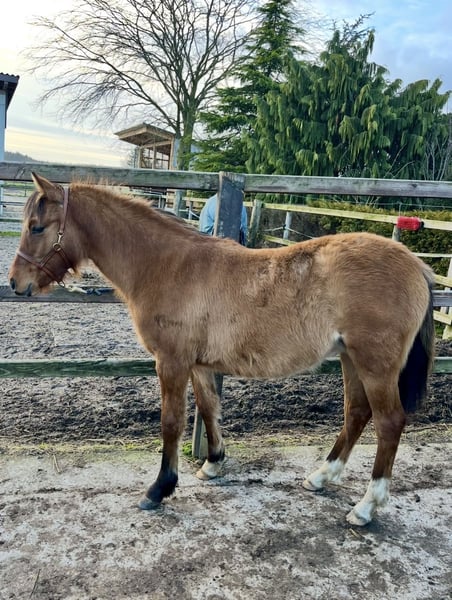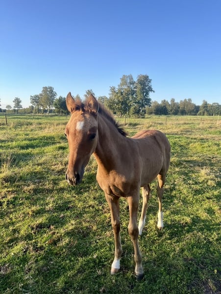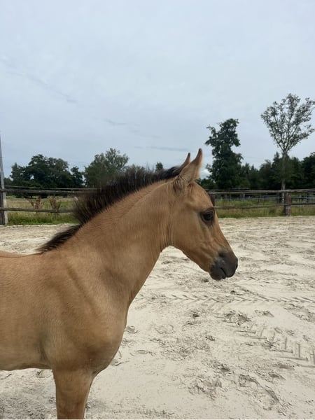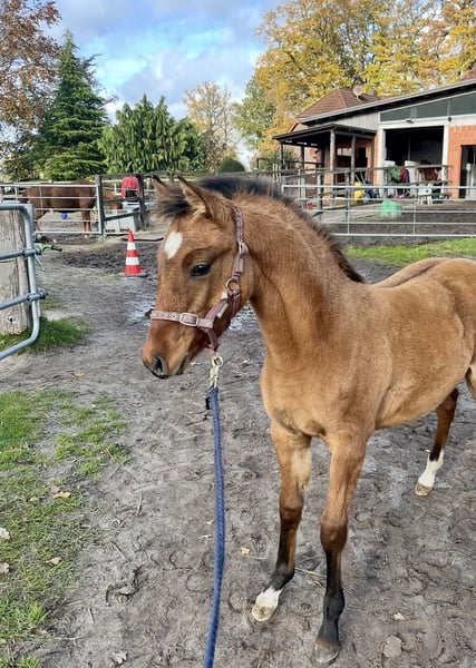 Moin, Zum Verkauf steht eine sehr hübsche und typvolle falbfarbene Deutsches Reitpony Stute, geboren Mitte Juni. Sie wächst derzeit in einer gemischten Herde gemeinsam mit ihrer Mutter auf und genießt eine familiäre Aufzucht. Sie hat eine sehr vielseitige Abstammung: Cooper County WE (Kastanienhof), der erfolgreich in S Dressuren zwischen Großpferden, aber auch Springen bis L läuft x Rikado, er hat einige Nachkommen die erfolgreich im Springsport sind Sie bleibt definitiv im Ponymaß. In der Herde tritt sie selbstbewusst und sozial auf. Im Kontakt mit Menschen zeigt sie sich besonders lieb, offen und zutraulich. Das Fohlen-ABC beherrscht sie bereits sicher. Sie lässt sich problemlos führen, kennt das Putzen und zeigt sich im täglichen Umgang brav und unkompliziert. Spaziergänge, sowohl alleine als auch in Begleitung anderer Pferde, meistert sie bereits souverän. Auch das Verladen und Hängerfahren kennt sie schon und bereitet keinerlei Probleme. Beim Hufschmied ist sie vorbildlich und gelassen. Sie ist geimpft und regelmäßig entwurmt. Sie soll noch bis April bei ihrer Mutter bleiben und darf dann gerne in ihr weiteres Zuhause umziehen.