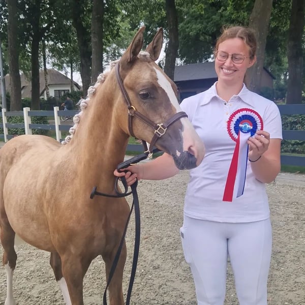 Beautiful first-premium foal offered. Winner of the all-round foal championship at the regional West NRPS inspection. Her mother is Liebharts Dream Girl, a mare with provisional keur status and radiographed. Sired by FEI stallion Del Estero. The sire is the Cremello stallion Rivers Dancing AS, a stunning German riding pony. Dahabi has been well-raised. He is familiar with everything: leading, grooming, washing, etc. As we expect foals every year, we are unable to keep them all. We are looking for a loving home for Dahabi.