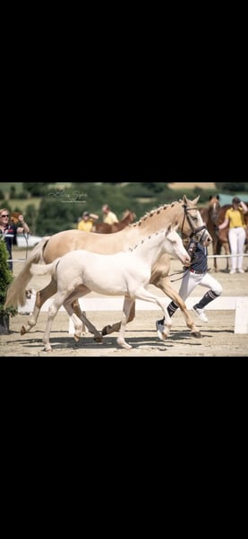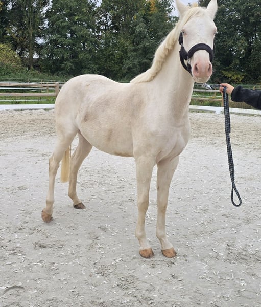 Queen is 2,5 jaar oud en heeft een schofthoogte van 145 cm. We hebben haar destijds bewust als veulen gekocht, sindsdien is ze bij ons in de opfok. Ze heeft een karakter van goud, is super ongecompliceerd en zeer sociaal naar haar soortgenoten. Aangezien we oudere merries voor onze fokkerij hebben aangeschaft, zoeken we voor deze bijzondere merrie een liefdevol thuis. Queen is niet alleen super cool en prachtig, maar beschikt ook over 3 goede gangen en een zeer rittig pedigree. Haar vader Dating AT NRW is succesvol tot en met de zware klasse, haar moeder is FS Champion Deluxe, een van de meest succesvolle topverervers. Een ruwe diamant om zelf op te leiden. Met grote waarschijnlijkheid zal ze na de juiste opleiding een betrouwbaar kinderpony worden. Ze is als veulen met de gouden medaille bekroond. Ze is opgegroeid in een kleine groep met leeftijdsgenoten. Het beste voer en veel beweging zijn voor ons vanzelfsprekend, evenals ontwormen en regelmatige afspraken bij de smid. Tetanusvaccinatie is ook volledig. Een zeer correcte merrie in bijzondere kleur die geen wensen onvervuld laat. Pedigree zie afbeelding. Bij serieuze interesse graag een bericht sturen.