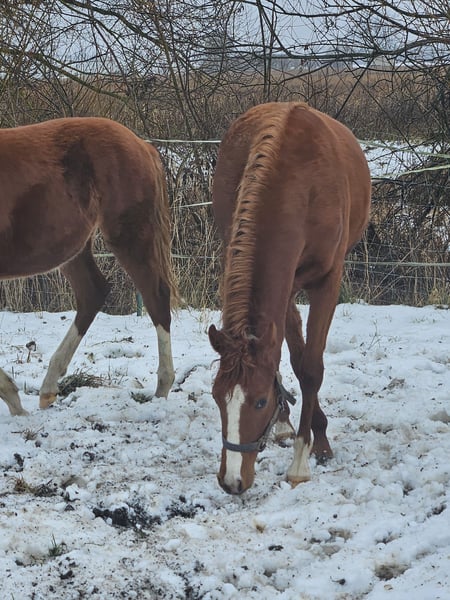 Elegant German Riding Pony mare, born in 2024, with a beautiful chestnut coat. This promising young prospect impresses with her appealing appearance and a promising temperament. She has already been gently started and displays a solid basic training. Thanks to her robust constitution and balanced nature, she is ideal for ambitious young riders or breeding enthusiasts who value quality and character. A great opportunity to bring a young, dressage-oriented Riding Pony with great potential into the future. She has excellent pedigree; the dam and half-sister can also be viewed on-site. We look forward to meeting you.