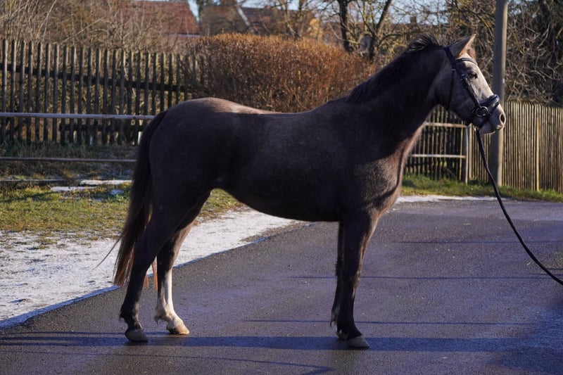 On behalf of a friend, a German Riding Pony mare born in 2023 is being offered. She is currently 135 cm tall and grey in color. This charming German Riding Pony mare was foaled in 2023 and impresses with her friendly nature and her lovely appearance. She is a daughter of the Welsh Pardbret mare Trinket, who is used as a children's and youth pony in leisure riding and also competes with her rider in WBO competitions. She can be seen in the last photos. She is paired with the well-built Riding Pony stallion Grand Coeur, who also impresses with his rideability and calm demeanor. She was raised in a small, mixed-age herd in private ownership with a family background. As a foal, she was awarded 24 points in her licensing. Her estimated final height is around 1.40 m. She has received regular vaccinations and deworming treatments. Total Gold has a pleasant temperament and is very well-behaved in handling. She has been lunged and tested in free jumping. She also proves to be very manageable in unfamiliar environments and loads easily by herself. Ideal for pony enthusiasts seeking a reliable and lovable leisure pony for self-education and training. For more information, questions, and videos, please feel free to contact me.