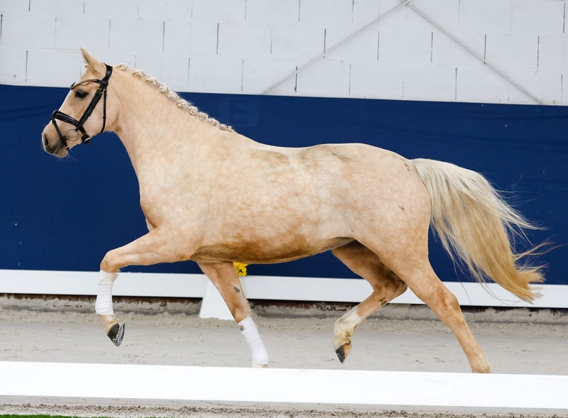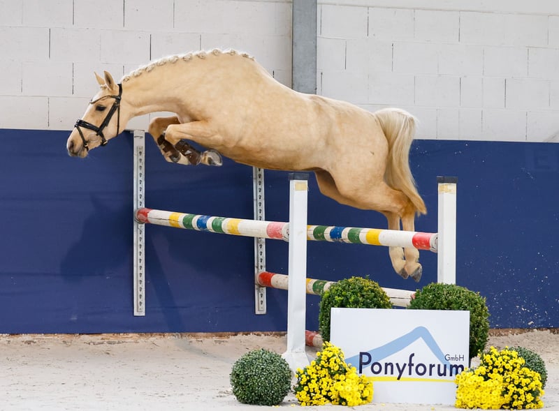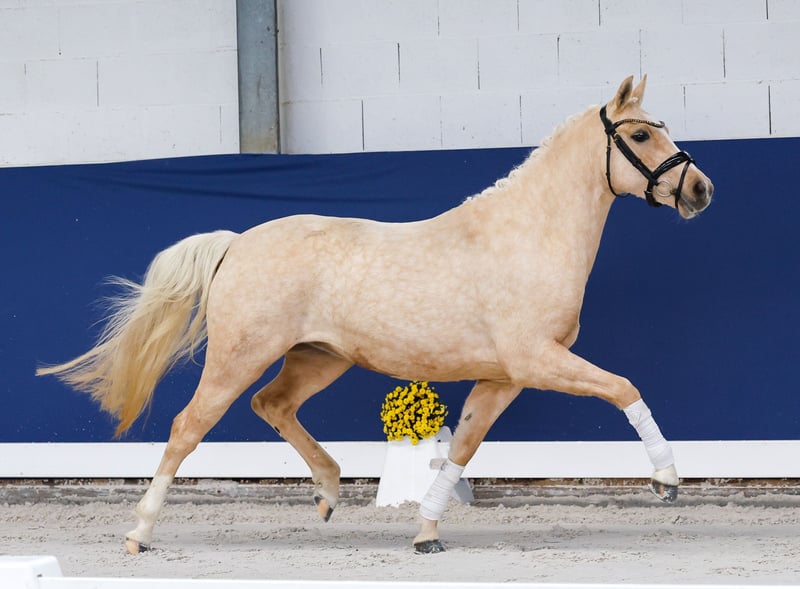 In unserer Kollektion stehen streng selektierte Youngster f�r alle Anspr�che: Ausbildungs-, Zucht- und Kinderponys Hier gelangen Sie zur Gesamtkollektion: https://ponyforum.auction Domino Dancing JM – unser kleines Superblondie mit dem großen Doppeltalent! Die hübsche mittelrahmige Palominostute ist ein großherziges Pony. Ihre Aufzucht auf einem Kinderponyhof merkt man ihr an, sie ist unerschrocken und absolut sozial zu anderen Ponys. Ihr Vater Mescal war Doppelbundeschampion der Springponys und setzte seine Reitportkarriere danach hocherfolgreich unter dem Dressursattel fort, er kann heute Viereckerfolge in der Klasse S verbuchen! Hier wächst ein toller Allrounder für die jüngeren Nachwuchsreiter heran, der mit seinem Doppeltalent perfekt für Familien ist! Direkt vom Züchter.