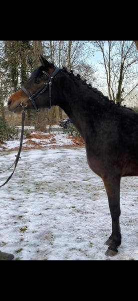 Enjoy est une ponette de sport allemande, typée, mesurant 1,47 m, âgée de 4 ans, avec de bonnes allures de base et une conformation correcte. Elle est une jeune ponette sensible et réactive, dotée d’un grand potentiel pour sa future formation. Enjoy a été doucement mise en selle et se montre volontaire et bien éduquée sous la selle. Au longe, elle marche en toute sécurité dans les trois allures de base et répond très bien aux aides vocales. Elle connaît déjà le travail aux barres au pas, au trot et au galop, ainsi que le saut en liberté, qu’elle apprécie beaucoup. Dans son quotidien, Enjoy est amicale et proche de l’humain. Elle aime qu’on la brosse, qu’on la selle et qu’on lui fasse les pieds. Elle adore aussi voyager en van et se laisse facilement charger. Les balades en terrain ouvert (sans autre cheval) se passent sans problème. Son attachement à l’humain est particulièrement remarquable. Dans son comportement quotidien, elle est très douce et facile à vivre. En saut en liberté, elle montre qu’elle a hérité des qualités de son père, Don Deluxe, spécialiste du saut d’obstacles. Elle a grandi directement chez nous à la ferme, où elle connaît les tracteurs, les chiens, les chats, les grosses machines, etc. En tant que pouliche de lait, elle a été primée. Enjoy est très compatible avec d’autres chevaux. En raison de son âge et de son niveau de formation, Enjoy n’est pas encore adaptée à un cavalier débutant. Elle recherche une personne douce et calme, qui prendra plaisir à continuer la formation d’un jeune cheval. L’été dernier, Enjoy a présenté un léger eczéma estival saisonnier, très facile à gérer. Elle n’a pas nécessité de couverture ou autre protection. C’est pourquoi elle est vendue à un prix très avantageux. La vidéo la montre lors de son premier saut en liberté ❤️ en décembre. Les photos ont été prises il y a quelques jours. Si vous êtes intéressé, je serai ravie d’être contactée. Pour un essai, une participation de 30 € sera demandée pour couvrir les frais (qui seront déduits en cas d’achat). Contact par WhatsApp au 0170-8323905.