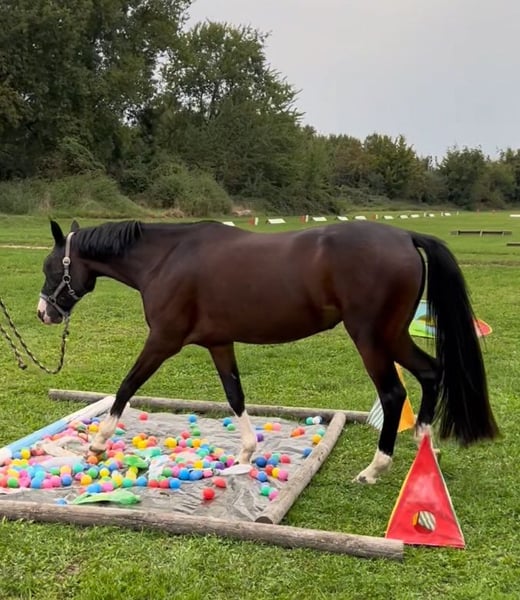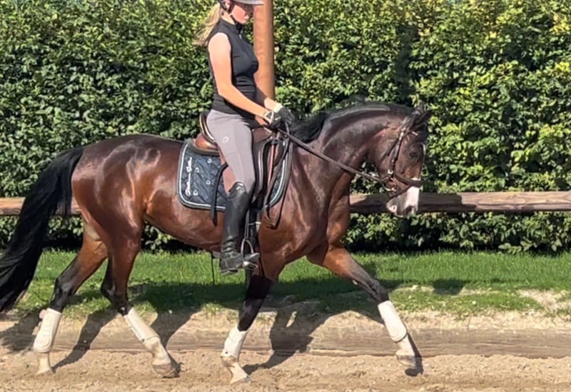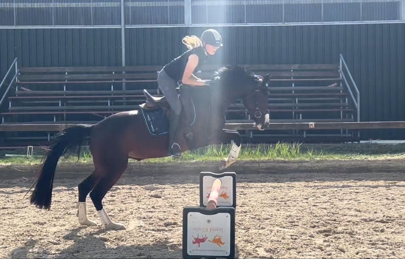 Monty, a 4-year-old pony mare standing approximately 1.48m tall with a character made of gold, is looking for a loving family with a 5* home. Monty was awarded as a foal, started under saddle at 3 years old, and then returned to the pasture. At 4 years old, she was introduced to light work in the first half of the year and has learned various things with us over the past few weeks. She is a fantastic all-rounder and is characterized by her lovable nature. She is still at the very beginning of her training, but she learns quickly, is not fearful, and wants to please. She confidently leads on trails and remains unbothered by cyclists, tractors, and cars. Therefore, I can also imagine her becoming a great driving pony. She is already familiar with some preparatory exercises and has impressed us with her calmness. Visually, she is a real eye-catcher. Monty has a healthy go, is hardworking, but is easy to handle. In dressage, she is at the level of dressage horses A and knows small jumps over cavaletti. Monty would certainly make a great family pony, provided she goes to a horse-experienced family where she can continue to be supported and trained. She has no vices and is really uncomplicated and fearless in handling. A veterinary examination including 12 X-rays from August 2025 is available upon request! Further videos can be sent after a phone call. We wish for her a loving home where she will win all hearts with her beautiful appearance and wonderful character.