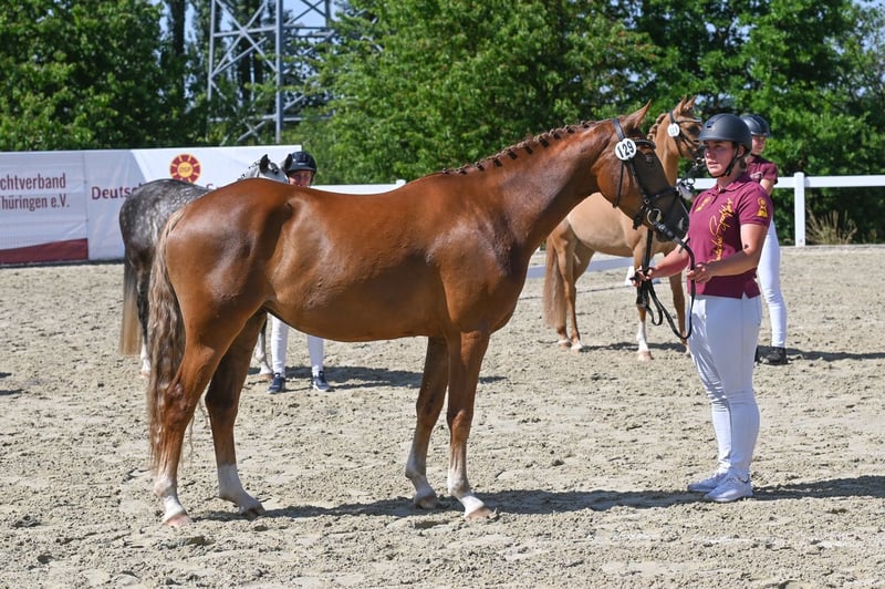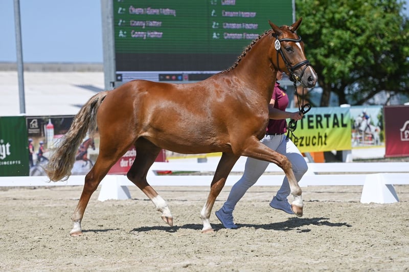 Peau a Peau ist eine bildschöne, typvolle und bewegungsstarke Reitponystute mit hervorragender Abstammung und Zukunftsperspektive -sowohl für den Sport als auch die Zucht. Sie stammt ab von Golden Grey NRW aus der Staatsprämienstute Poetin von Quaterback´s Junior.Ihre Mutterlinie ist bekannt für äußerst typvolle und bewegungsstarke Nachzucht- unter anderem brachte Poetin 2023 das Siegerfohlen "Pretty Woman HC" von D-Gold AT NRW bei den Reitponystutfohlen. Im April wurde Peau a Peau schonend angeritten und zeigte sich dabei stets fleißig, lernwillig und ausgeglichen. Sie hatte bisher einen Start in einer Reitpferdeprüfung, wo sie mit ihrer Losgelassenheit und ihrem taktsicheren Schritt punkten konnte. Auch bei der Staatsprämienschau zeigte sie sich von ihrer besten Seite und beeindruckte durch ihre Bewegungsgüte.Besonders hervorzuheben ist ihr Erfolg als Reservesiegerin bei den Deutschen Reitponys Sachsen-Thüringen in Wolfersdorf, was ihre Qualität als zukünftige Sport-und Zuchtstute unterstreicht. (Staatspämienanwärterin) Nach der Staatsprämienschau haben wir aufgrund ihres Alters und zur weiteren Entwicklung beschlossen, sie nochmal auf Dauerweide zu stellen, wo sie sich im Herdenverband als ranghoch,aber sehr sozial und verträglich zeigt. Derzeit sind wir mit Peau à Peau wieder im Aufbautraining. Ein Probereiten ist ab dem neuen Jahr möglich. Wir wünschen uns für Peau a Peau ein förderndes Zuhause, das die Qualität und das Potential dieser besonderen Stute zu schätzen weiß und sie ihrem Talent entsprechd weiter ausbildet.