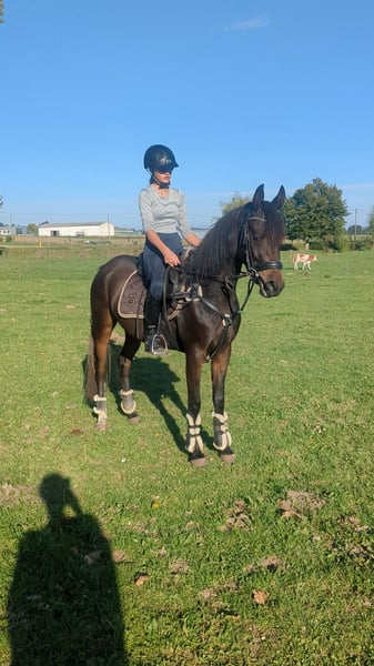 **Annonce de vente : Jument Poney de Selle Allemand** À vendre, une charmante jument de poney de selle allemand, de couleur brun foncé. Née en 2022, elle est déjà devenue une jeune dame prometteuse. Avec une taille au garrot de 148 cm, elle est idéale pour les cavaliers à la recherche d'un partenaire talentueux pour le saut d'obstacles. Cette jument montre un grand potentiel en saut et a déjà acquis ses premières expériences sous la selle. Elle est bien éduquée, douce dans le travail et fait preuve d'une curiosité et d'une volonté d'apprendre constantes. Elle convient aussi bien pour les loisirs que pour les compétitions et attend avec impatience de vivre de bons moments avec son nouveau cavalier. Pour toute question ou pour plus d'informations, je suis à votre disposition. Un essai est possible sur rendez-vous. Nous attendons votre message avec impatience !