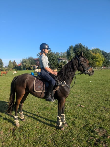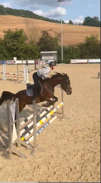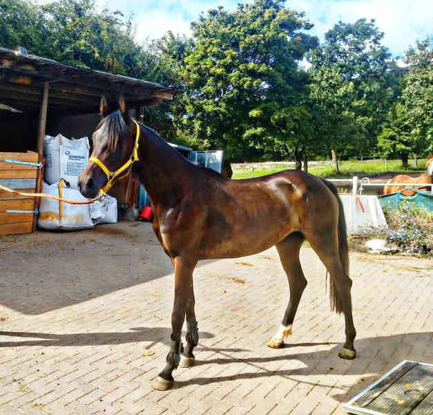 **For Sale: German Riding Pony Mare** For sale is a charming, dark brown mare of the German Riding Pony breed. Born in 2022, she has already developed into a promising young lady. With a height of 148 cm, she is ideally suited for riders looking for a talented partner for show jumping. This mare shows great potential in jumping and has already gained some experience under saddle. She is well-mannered, easy to handle, and always curious and eager to learn. She is suitable for both leisure and competition riding and is looking forward to experiencing much joy with her new rider. If you are interested or need further information, please feel free to contact me. Trial rides are possible by appointment. We look forward to your message!