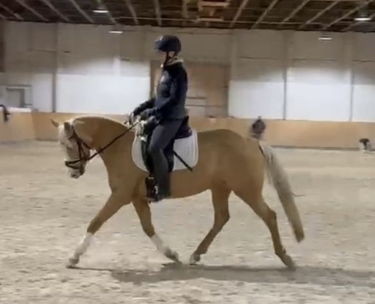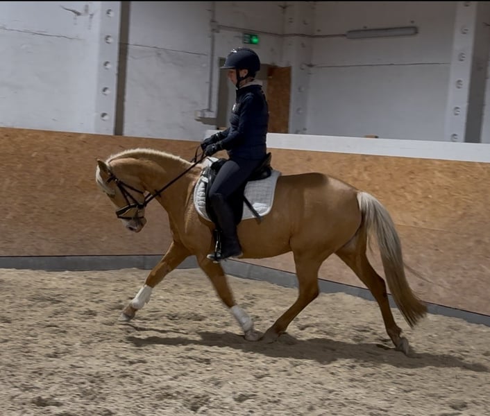 For sale is a 4.5-year-old German Riding Pony State Premium mare in the stunning Palomino color. She impresses not only with her friendly, people-oriented nature but also with her excellent basic gaits and her ambition under saddle. She is easy to ride for everyone and a joy to sit! She is very well-behaved and absolutely reliable, making her an ideal children’s pony. She is highly eager to learn, clear-minded, and pleasant to work with daily. She successfully completed her performance test and was awarded the State Premium mare title in September. She has excellent potential for sport and breeding. Her training is appropriate for her age, and she shows great talent for further development. Perfect as a family pony, children’s pony, or young sport horse. A mare that captivates with her quality, character, and color – a true treasure for a family, competitive riding, or breeding. A current TÜV inspection with no findings is available! Further information, videos, and viewing by arrangement.
