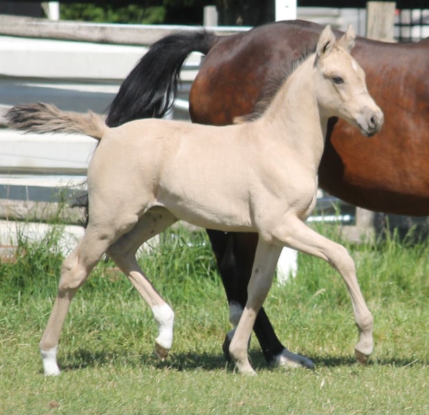Vente d'une jument ponette allemande – Parfaite pour le loisir ! Nous proposons à la vente une magnifique jument ponette allemande, née en 2020. Elle est d’un élégant palomino avec une taille d’environ 150 cm au garrot. La jument est idéale pour le loisir et est encore totalement vierge, prête à être formée dans différentes disciplines à l’avenir. Elle a été achetée il y a 4,5 ans en tant que future ponette de conduite, mais cette activité ne lui convient pas. Elle est désormais montée en loisir avec beaucoup d’assurance. Cependant, comme nous privilégions la conduite en attelage, elle n’a pas encore atteint le niveau qu’elle pourrait avoir à 5 ans. Si vous êtes intéressé, n’hésitez pas à me contacter au 0163/7291017 ou par email à kschleicher@schroeter.gmbh. Les détails peuvent être communiqués en personne. Des radiographies de l’été sont disponibles. Pour toute question ou pour organiser une rencontre, je reste à votre disposition.