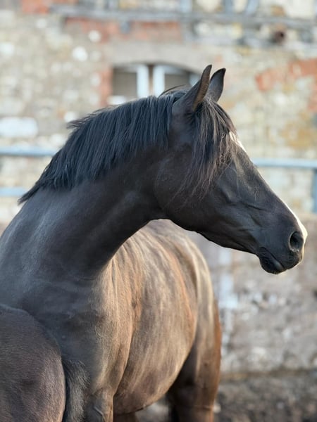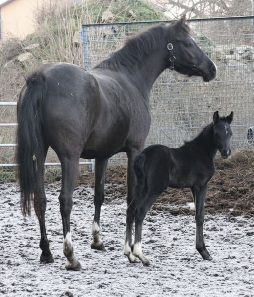 Unique opportunity: Due to a change in breeding focus, we are offering this exquisite broodmare for sale. Angel was in professional training for six months and has since been used exclusively for breeding. She placed 3rd at the Elite Mare Show and was the winner of the SLP mare class, impressing especially in jumping and rideability. She has a very promising black colt by the stallion PH No Problem at her feet and is currently pregnant by him again. Angel is being offered solely due to lack of a rider and a shift in breeding plans. She could certainly make a very good riding pony once re-trained. A sale including the foal is possible immediately, and the return of the foal could also be considered. Her color is Smokey Black, which could not be selected.