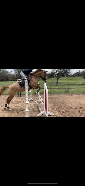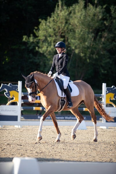 For sale is a very stylish, colorful 5-year-old mare (German Riding Pony). Donna has been with us since she was a foal and has been raised as a proper riding pony. At three years old, she was gently backed by us. This July, she was measured at 14.8 hands. She has an honest and reliable character and is equipped with a pleasant go. Her three basic gaits are very good, with the walk standing out in particular. She won the 4-year-old Pony Riding Horse Test and placed 2nd against larger horses. She has also been placed 2nd and 3rd in Dressage Horse A and L Dressage, competing against full-sized horses. We have already started working on extended trot, lateral movements, and L-level lessons, and she is quite stable in these. Our 13-year-old daughter has been riding her from the beginning. She is an absolute reliable pony, no matter the situation—whether in the field, indoor arena, or on the riding yard. She is always alert and focused. She masters her first jumps under saddle with ease and confidence. Due to lack of time, we have decided to sell her. If you are interested or would like more information, please feel free to call me at 015209130259.