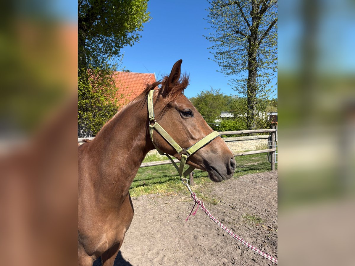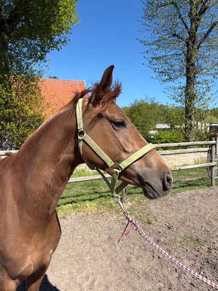 Verkaufen eine 4 jährige, gerade in Münster angerittene liebe Fuchsstute mit guten Grundgangarten und viel Potenzial. Sie stammt von D-Gold und Grazia 3 ab!