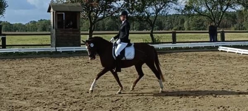 Zum Verkauf steht eine 6 jährige Dt. Reitpony Stute Stockmaß 1,44 m in einem wunderschönen Dunkel Fuchs Ton. Sie ist bereits Staatsprämienstute. Sie besticht mit einem absoluten traumhaften Charakter und ihrem liebevollen Wesen. Sie kann auch schon kleine sportliche Erfolge im WBO Bereich nachweisen. Sie ist super lieb, sehr Menschen bezogen und zeigt sich im täglichen Umgang unkompliziert und klar im Kopf. Egal ob putzen, Schmieden oder verladen, sie macht alles brav mit und ist ein wahre Freude im täglichen Umgang. Unter dem Sattel ist sie rittig, mit viel go ausgestattet, leistungsbereit und stets konzentriert. Am Sprung zeigt sie eine tolle Einstellung mit viel Übersicht und genügend Vermögen für höhere Aufgaben. Eine wunderbare Nachwuchsstute für ambitionierte Reiter, die ein verlässlich motiviertes und sportlich talentiertes Pferd zur weiteren Ausbildung suchen. Sie hat eine sehr gute Leistungsprüfung abgelegt. Sie ist eine doppelveranlagte Stute auch von Kindern geritten. Im Gelände ein Traum. Bei Interesse oder weiteren Fragen beantworten wir gerne weitere Fragen.