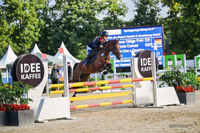 Sprzedajemy naszą samodzielnie wyhodowaną, pięcioletnią, piękną, odnoszącą sukcesy i wyrazistą klacz sportową „Noblesse Oblige FHH“. Już wielokrotnie plasowała się na wysokich miejscach w konkursach skoków w klasach A* i A**. W 2025 roku zakwalifikowała się do Mistrzostw Niemiec dla 5-letnich koni sportowych i tam otrzymała niezmiennie wysokie oceny. Na parkurze Noblesse wykazuje dużą odwagę, ambicję i jest całkowicie nieprzestraszona czynnikami zewnętrznymi. Zawsze chętna do pracy i zaangażowana, powinna być dalej rozwijana ze względu na swój sportowy charakter. W relacji z ludźmi jest bardzo spokojna, dobrze znosi załadunek i lonżowanie. Na wycieczkach w lesie okazuje się równie niezawodna jak na parkurze. Skacze przez pniaki, bez problemu przechodzi przez strumienie i wodę. Noblesse posiada także trzy bardzo dobre podstawowe chody. Zna wypas w stadzie i samodzielnie; kowal i weterynarz są dla niej – jak i dla wszystkich ludzi – otwarte i przyjazne. Ze względu na wiek i poziom wykształcenia, Noblesse nie jest odpowiednia dla początkujących jeźdźców. Noblesse ma niezwykle sportową i interesującą rodowód: jej ojciec „FS Numero Uno” odnosi sukcesy w konkursach ujeżdżenia do poziomu S i ma liczne, odnoszące sukcesy potomstwo w czołowym sporcie. Matka „Deydoo L”, odnosząca sukcesy jako młoda klacz na Mistrzostwach Niemiec, przez wiele lat zdobywała liczne zwycięstwa i wysokie miejsca, także na arenie międzynarodowej, w trudnej klasie Pony M** aż po Mistrzostwa Niemiec. „Deydoo L” była nie tylko ambitna i z najlepszym nastawieniem, ale także zawsze niezawodna. Po karierze sportowej wspierała liczne młode konie w wejściu do skoków. Półbrat Noblesse, „Doctor Strange”, odnosi sukcesy w konkursach skoków na koniach typu pony w Polsce.