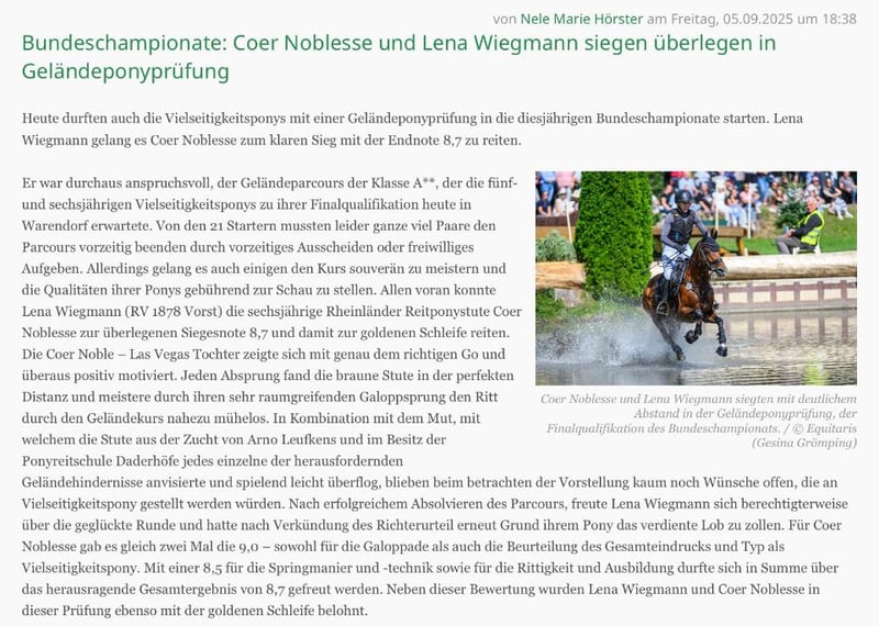 Na sprzedaż 6-letnia klacz Coer Noblesse (Coer Noble x Las Vegas) o wzroście 1,46 m. Connie zachwyca bardzo dobrymi podstawowymi chodami, dobrą jezdnością i doskonałym sposobem skakania. Jest bardzo sportowym kucem, który jest bardzo zwrotny i niezawodny, szczególnie przy skokach. Connie to wyjątkowy kuc, który już w młodym wieku odniósł wielkie sukcesy. Została zwycięskim kucem w finale kwalifikacji dla 5-/6-letnich kuców wszechstronnych na Bundeschampionat 2025 z końcową oceną 8,7. Ponadto wygrała skoki dla koni A przeciwko dużym koniom i została już pewnie przedstawiona w skokach dla koni L. W miniony weekend wygrała skoki dla koni A z oceną 8,4. Niestety w finale na Bundeschampionat nie udało się zająć miejsca, ponieważ linia startu w terenie nie została przejechana, co skutkowało jej dyskwalifikacją. W codziennym obcowaniu jest prawdziwym kucem serca. Jest grzeczna, przytulna i łatwa w obsłudze. Connie zna jazdę na sobie przez dzieci i zawsze pozostaje grzeczna i uczciwa. Nie ma żadnych złych nawyków, takich jak brykanie czy stawanie na tylnych nogach, i jest bardzo przyjazna dla dzieci. Znajduje się w średnim przedziale cenowym i ma dobre zdjęcia rentgenowskie z ubiegłego roku. W przypadku zainteresowania i dodatkowych pytań czekamy na kontakt telefoniczny pod numerem 015732463127.