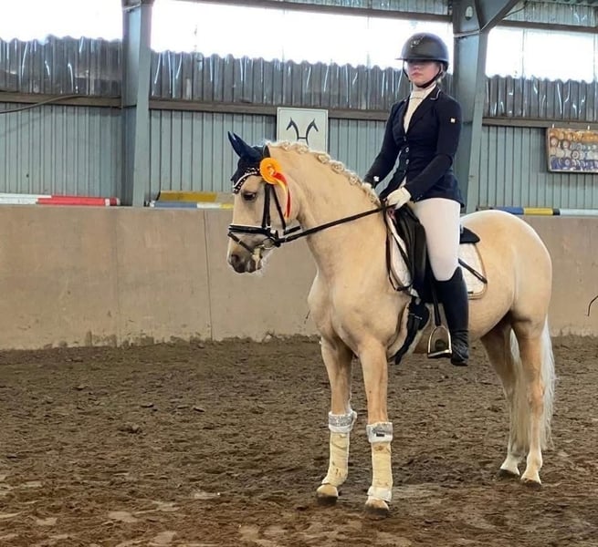 From our own breeding and training, we are offering a dream pony for the whole family. Tara tells you about herself... Description: I am a pony to fall in love with because I am: Loving, cuddly, and have a wonderful character, and I am not spooky. What I like: I love munching hay (you’re welcome to sit with me in the hay), and I enjoy being groomed to the fullest. Cuddling is my favorite. I’m also happy when I can be out in the pasture. What I already can do: At just 4 years old, I was invited to the Federal Foal Show in Münster. There, I was able to show that I can already perform a good dressage test with my rider (in the large championship arena), and I also do well in jumping. That’s why I was also placed in the competition for versatile riding ponies (the young ponies). I also presented myself at the State Championship – it rained cats and dogs, really terrible – but I bravely completed my tasks. I am a fighter! 😍 I really enjoy competing at shows – it’s a lot of fun for me. I am currently doing dressage and will soon start in class L. My sporting future: Since my mother was a very successful competition pony for a long time, I also want to compete in FEI classes someday. What I don’t like: When I am forgotten or when I am not allowed to go out to the pasture. My wish: I am always waiting for my people and hope to find a wonderful family. I’d love to make a child or, even better, the whole family happy. Feel free to visit me – you can also arrange an appointment with my breeder: 0173 6782519 Susann Heise