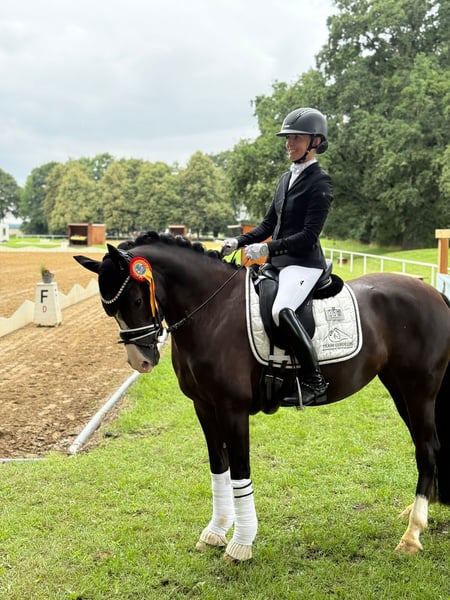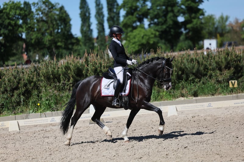 This beautiful 5-year-old riding pony mare is available for sale. She possesses impressive, above-average conformation and movement. Thanks to her strong willingness to collect and her ample spirit and talent for advanced dressage movements, she is the perfect partner for the big arena. Currently, she has completed Level M dressage training. She is also ready to be used as a future FEI pony. For her age, she is very easy to ride and offers a very comfortable contact. She measures 148 cm with shoes. - Eye-catcher - Convincing movement quality - Riding pony mare by Designed in Black AT - Multiple wins in Dressage Pony Levels A and L, only competed against larger horses - 148 cm with shoes - Light-footed, easy to sit - Good X-ray results available - Born and raised in Austria For further information, please contact us by phone at 017622388605.