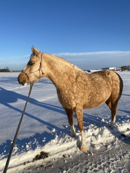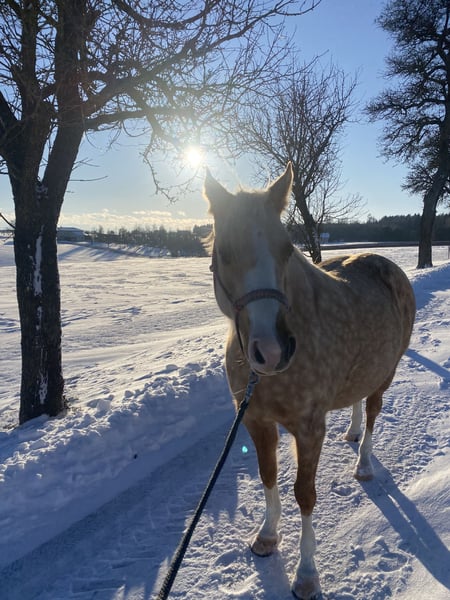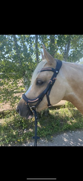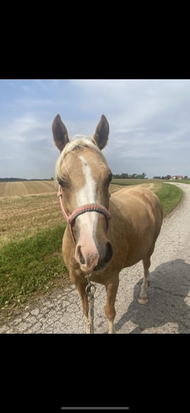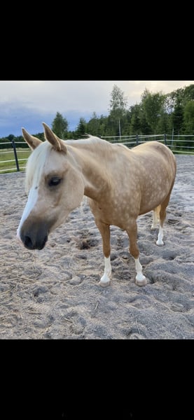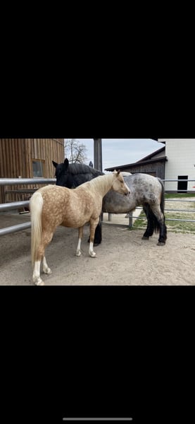 For sale due to a change in my riding plans: my 7-year-old German Riding Pony mare, Goldmarie. She is a very sensitive and intuitive mare, but still requires consistency and structure. I’ve had her since she was a foal; she has always been kept in an open stable, is very social, and needs turnout. She tolerates box stall living, but quickly becomes impatient and starts knocking at the door, etc. 24-hour hay is unfortunately not ideal for her, but I cannot offer anything else, and as a result, she has always been quite overweight with me. She also needs limited grazing, typical of a pony. She has been gently backed and is very responsive to aids, but over the past year, most of her work has been ground work or ridden out. She is capable of going alone or in a group into the terrain, but can be somewhat spooky. Overall, she is not suitable for beginners or children; you should be confident in the saddle and experienced with young horses. In 2024, she suffered from placentitis, which unfortunately resulted in a stillbirth. She was treated and flushed afterward, but we did not breed her again. Whether she could be used for breeding should be carefully evaluated beforehand. She is shod in front because our terrain is very stony and includes many roads. She behaves impeccably with farrier and veterinarian. Trailer loading is generally no problem. I am selling Goldi only because she is too valuable to stand around doing nothing and is getting too fat. Perhaps she will find someone who appreciates her and works with her properly. Please no price inquiries only; due to winter, trial rides are limited at the moment. She will be sold with all accessories. Feel free to contact me via WhatsApp; I am available by phone only after 3 p.m.