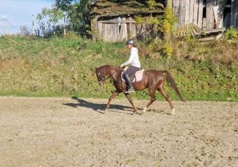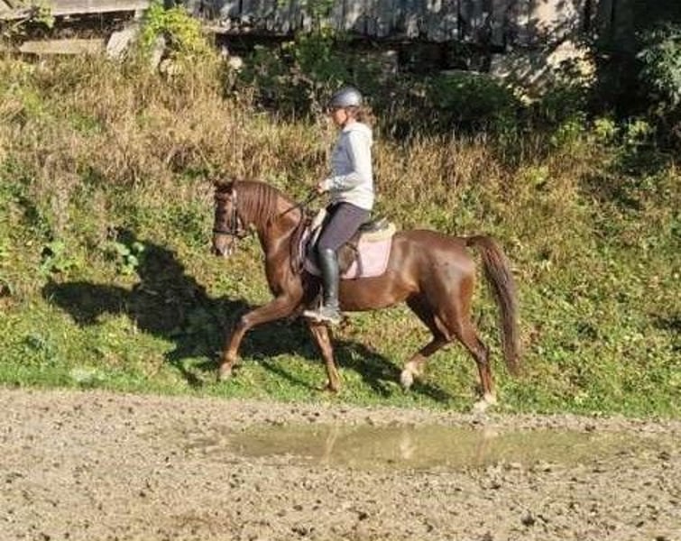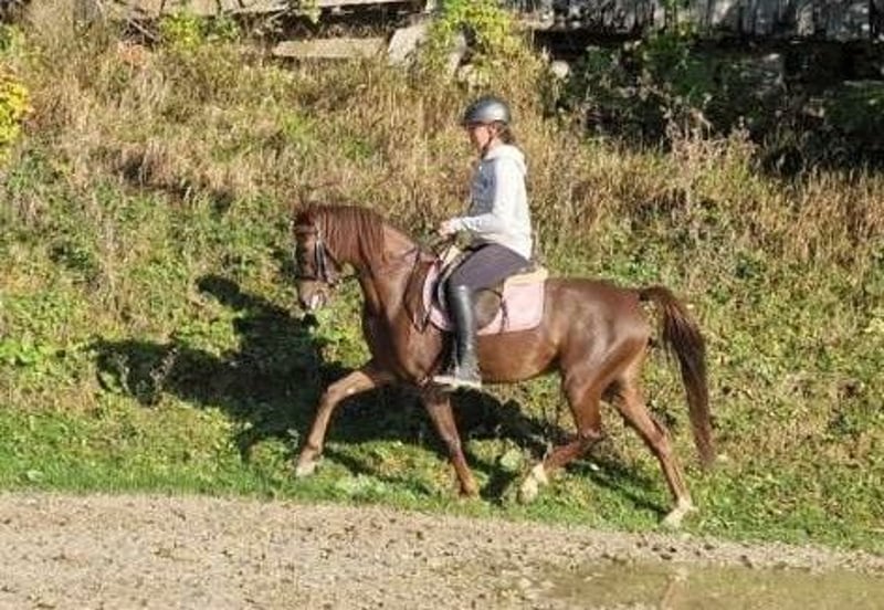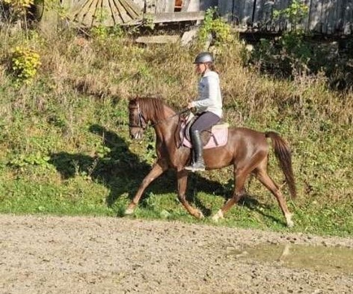 For sale: Beautiful German Riding Pony mare with an exceptional pedigree. Born in 2019, this mare by Dance Star measures 142 cm in height. She has three beautiful basic gaits, an expressive personality, and is loving and very trusting. She was lightly backed in summer 2024 and then went into a winter break. Since April, she has been gradually re-initiated under saddle and already shows herself to be confident, movement-rich, and relaxed in the saddle. She is very well-behaved, and it’s as if she never had a break. This mare is also valuable for breeders, as her outstanding lineage combines major riding pony lines. Her fine head and cool demeanor come from the full-blood line of Temptation. Her excellent gait is inherited from Golden Dancer. Price will increase with her level of training.