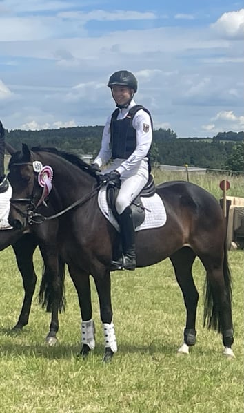 Due to the end of my son's "pony age," we are selling our 8-year-old full-sized mare Gwendolyn. The pony has achieved wins and placings in show jumping up to 1.15 m (has jumped up to 1.25 m) and in eventing up to CCIP**L level. Last year, Gwendolyn was part of the national eventing squad. She jumps very confidently and carefully, so we can also see her competing in show jumping. Stopping is not an option for Gwendolyn. Due to her temperament, her eagerness to move forward, and her always positive attitude towards jumping, she is not suitable for beginners or small children. Gwendolyn is straightforward and gentle in handling. She is healthy but occasionally nicks herself when she has opportunities to rest her hooves in the box, which is why we are offering her below market value. Her unconditional willingness to perform and her excellent attitude towards sport are remarkable. Thanks to her size, she also suits larger riders.