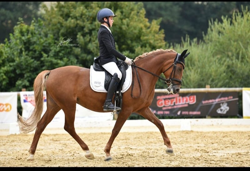Schweren Herzens suchen wir für unsere liebe leistungsstarke 8 jährige Deutsche Reitponystute (im Hengsttyp, Fuchs, Endmaß) mit tollen Anlagen und Turniererfahren ein neues 5* Zuhause. Sie ist Bundeschampionats Finalistin der 4 jährigen Pinys, Dressurpferde A platziert und mit meinem 11 jährigen Sohn A Dressur siegreich, mehrfach A** und L Dressur platziert. Zudem Kaderpony Dressur 2025 und 2026. Da abstammend von einem erfolgreichen Springpony macht sie auch einen guten Sprung, dies wurde aber nicht weiter gefördert Sie ist ein absolutes Herzenspony. Sie läuft sehr leicht durchs Genick, hat tolle GGA, einen hervorragenden, geregelten Schritt, eine tolle Galoppade und ist leicht zu sitzen. Sie beherrscht alle L und L**(FEI) Lektionen und ist als FEI Pony einsetzbar. Sie ist schon in jungen Jahren, da komplett lektionssicher, ein echter Lehrmeister. Man kann sie mit und ohne Ausbinder reiten. Kein Bocken, Steigen oder Durchgehen. Absolut lieb beim Verladen, während des Turniers oder im Gelände. Bei uns war sie nie krank und zeigte sich sehr robust. Wir wünschen uns von den neuen Besitzern ein Top Zuhause, wo sie weiter sportlich gefördert werden kann. Um Reittourismus vorzubeugen nehmen wir fürs Probereiten 35 Euro, die auf den Kaufpreis angerechnet werden. Das Pony wird nicht an Händler verkauft. Kauf von Privat, kein Händler