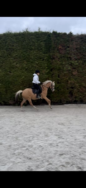 For private reasons, I am offering my German Riding Pony mare, born in 2017, Palomino, with a height of 14.0 hh. Bona is very easy to ride, responds well to gentle aids, and is generally quite sensitive. She is clear-minded and always easy to handle. She has a pleasant forward movement and can be ridden both bareback and with saddle, alone or in a group, in the field. She has also jumped small fences and enjoys it very much. Overall, she is always motivated and eager to learn. She is also well-behaved in handling. Bona has been ridden recreationally so far and has no competition experience. Although she appears sweet and well-behaved, she is not a children's pony and is not suitable for complete beginners or riding schools, as she is too sensitive. Last August, she unfortunately had a paddock accident in which three muscle layers on her belly and the extensor tendon on her hind left leg were torn. Her abdominal organs were not involved! Both injuries were successfully operated on, and she has no lasting issues and can be ridden normally. There are no restrictions regarding her feeding either. A veterinary report is available. Test rides and multiple meet-and-greets are definitely welcome. I might also consider offering her with a purchase option.