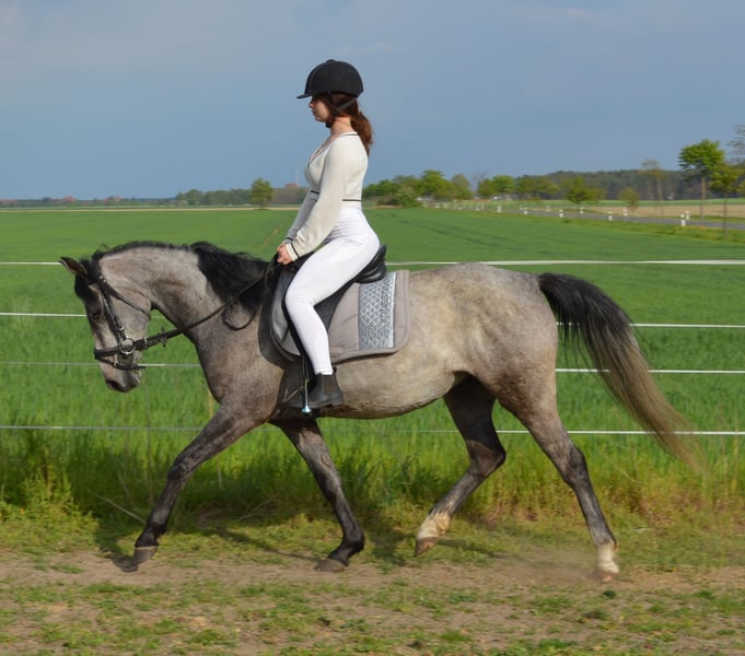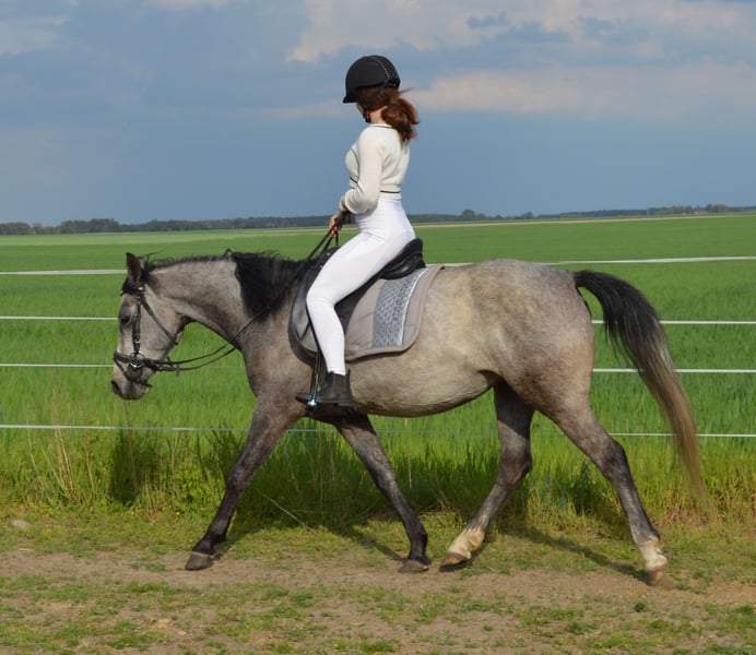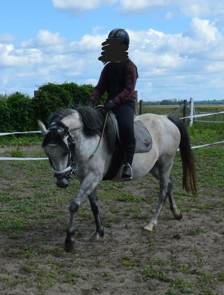 Beautiful 9-year-old riding pony mare, 1.45m, is still looking for her perfect person. Naturally healthy, vet check possible. Top trail pony, regardless of her position in the group; she has also been out alone and even went to get ice cream at Edeka. 😉 She has also competed in shows (E level). Very easy to lunge; when riding, she is not suitable for complete beginners (the basics should be established). She doesn’t rear or buck but can get a bit quick if you hold on too tightly. Recently, she participated in a summer riding camp, where she was with advanced children and also trained for Mounted Games. Videos available. Currently, she is standing around more than she should, as she is too nice for that. 😉
