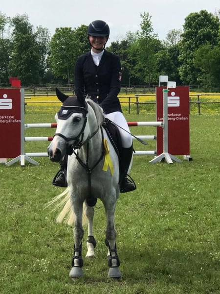 With a heavy heart, we are selling our pony mare Malissa due to switching to a full-sized horse. Malissa is a true pony diva, always eager and highly motivated. She has been successful in show jumping up to A** level, facing increasing challenges with enthusiasm. She has competed multiple times as a candidate pony at the Bavarian State Pony Championships and has participated twice in the South German Pony Championships. Malissa is excellent in handling, very affectionate, and loves cuddling. Of course, she is farrier- and loading-trainable. She also enjoys hacking, whether alone or in a group. We are looking for an absolute 5-star home so that Malissa can bring as much joy to a young rider as she has brought to us. Due to her motivation, she is not suitable for absolute beginners. Please contact us for more information if interested.