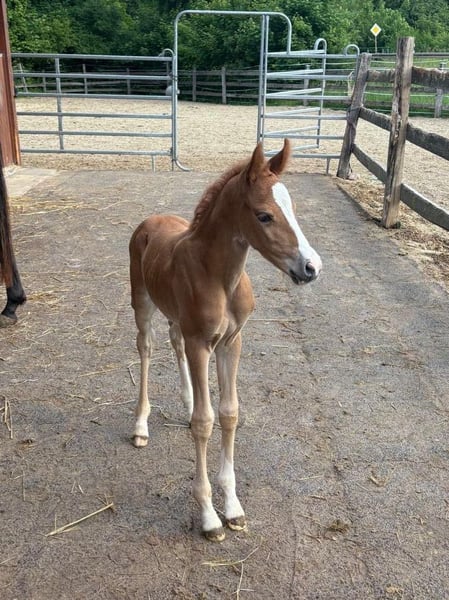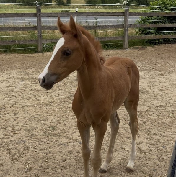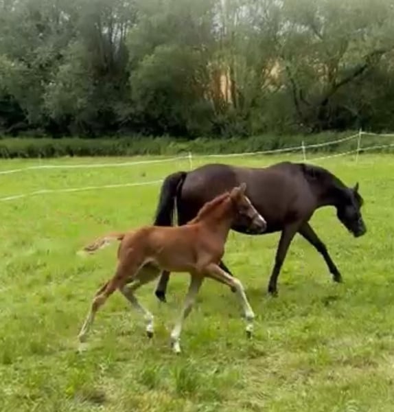 ZU VERKAUFEN: Deutsches Reitpony Stutfohlen Neverland x Golden Grey Stutfohlen aus dem letztem Jahrgang von Neverland WE (u.a. Siegerhengst, Bundeschampion, 2x Bundessiegerhengst, FEI) aus der Glossy Grace von Golden Grey NRW (u.a. 2x Vizebundeschampion, 2x Vizewestfalenchampion) Geboren 05/25. Sie ist sehr zutraulich und zahm. Wächst familiär im Offenstall direkt am Haus auf. Natürlich auch mit entsprechendem Weidegang. Das Fohlen hat tolle Bewegungen und wäre fürs Championat qualifiziert gewesen. Da ich selbst jedoch im Sommer frisch Mama geworden bin, konnte ich es leider nicht vorstellen. Die Mutterstute Glossy Grace ist eine 4-jährige Stute, die letztes Jahr von mir angeritten wurde, dann allerdings aufgrund meiner eigenen Schwangerschaft und Ihrer Trächtigkeit noch nicht weiter gefördert wurde. Sie ist Staatsprämienanwärterin und hat mehrere sporterfolgreiche sowie prämierte Vollgeschwister, eine Vollschwester lief 2023 erfolgreich Westfalenchampionat bis ins Finale und Bundeschampionat. Sie hat einen gekörten Halbbruder von Cosmopolitan. Die Großmutter des Fohlens mütterlicherseits (ebenfalls Staatsprämienstute) ist Zuchtstute und geht laut Rimondo mit Kindern kleine Turniere. Wirklich total kopfklar wie die Mutter des Fohlens auch. Kinder können die Mutterstute super easy händeln und bereits jetzt das Fohlen führen, putzen und Hufe geben. Bestes Kinderponypotential also! 🙂 Ein ganz tolles Fohlen mit Traum Charakter und viel Potential. Videos versende ich gerne auf Anfrage und natürlich kann das Fohlen nach Vereinbarung sehr gerne besichtigt werden.