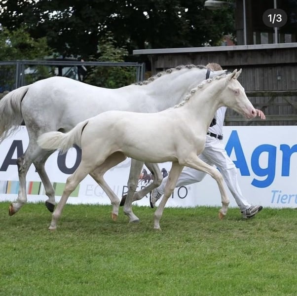 Sprzedam energiczną klacz źrebaka (prawdopodobnie przyszłe XXL kucyki). Doskonale sklasyfikowana - trzecie miejsce na Niemieckim Czempionacie Źrebiąt 25 w Lienen. Kucynka jest już odsadzone, dobrze wychowana (samodzielnie wchodzi do myjni, mycie ogona, spłukiwanie nóg, zakładanie maski na muchy, nakładanie derki, czyszczenie uszu, samodzielne wyprowadzanie z pastwiska itd. - żaden problem!) Kucyk szuka doceniającego domu, najlepiej w towarzystwie źrebiąt!