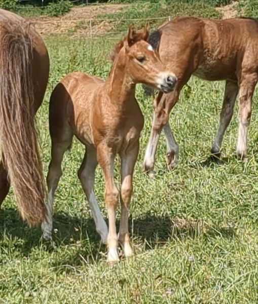 Dalla nostra allevamento offriamo una bellissima puledra con due zampe posteriori uniformemente bianche e stivali alti, figlia del doppio campione Mescal. Il puledro ha tre ottime andature, è sveglio, sicuro di sé e molto socievole. Il padre Mescal è stato campione nazionale dei pony da salto di 5 e 6 anni ed è attualmente attivo con successo nella disciplina del dressage fino alla classe S. La madre Princess Peach è attiva con i nostri bambini, passando da cavalieri di salto WB a salto di classe M con successo. Ha la giusta attitudine per lo sport, è sempre un ottimo compagno e un vero tesoro nel maneggiarla. Inoltre, ha 3 ottime andature, da sottolineare la sua fantastica galoppata ampia. La nostra Missy è quindi adatta a tutte le discipline, una vera tuttofare!