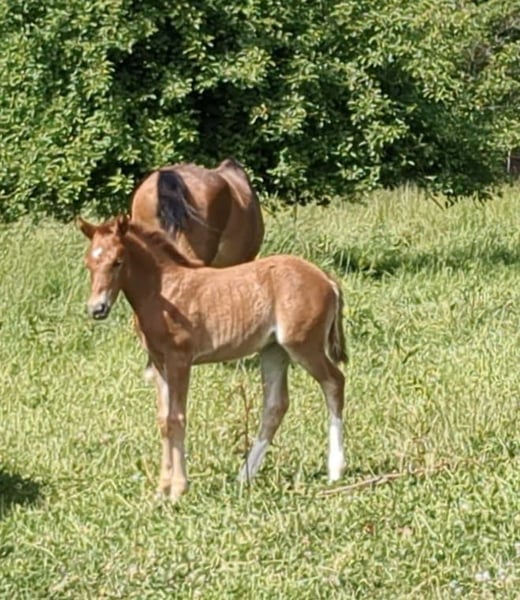 Aus eigener Zucht bieten wir ein bildhübsches, im hengsttyp stehendes Stutfohlen mit zwei gleichmäßig hoch weiß-gestiefelten Hinterbeinen von dem doppelveranlagten Mescal an. Das Fohlen hat drei sehr gute GGA, ist aufgeweckt, selbstbewusst und sehr zutraulich. Vater Mescal war Bundeschampion der 5- und 6-jährigen Springponys und wird seit 7-jährig schwerpunktmäßig in der Dressur bis aktuell Klasse S erfolgreich unterwegs. Mutter Princess Peach ist mit unseren Kindern von Springreiter WB bis Springen Kl. M erfolgreich unterwegs. Sie hat die notwendige Einstellung zum Sport, ist trotzdem immer ein toller Kumpel und ein wahrer Schatz im Umgang. Außerdem hat sie 3 sehr gute GGA, hervorzuheben ist ihre tolle raumgreifende Galoppade. Unsere Magica ist somit für alle Sparten zu haben, eine echte Allrounderin!