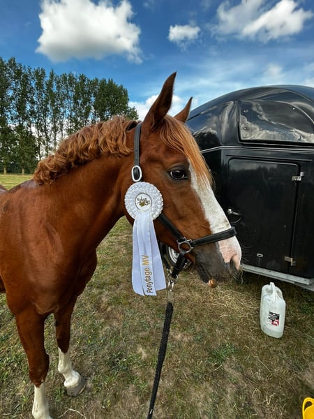 Crown, is a very handsome pony stallion with an excellent pedigree. He possesses 3 above-average basic gaits and is very pleasant to ride. He is motivated when jumping and always wants to get to the other side. In dressage, he is at a very good L level and has already competed in FEI tests, achieving placements. In jumping, he shows just as much potential and is therefore also great as an eventing pony. He is always kind and clear-headed and can be easily handled by young riders. He shows extremely high quality in movement and jumping as a hunter for the USA. Approved!!! Bundeschampionat finalist of the 5-year-old show jumpers. Shoeing and loading are easy. Vet check very good.