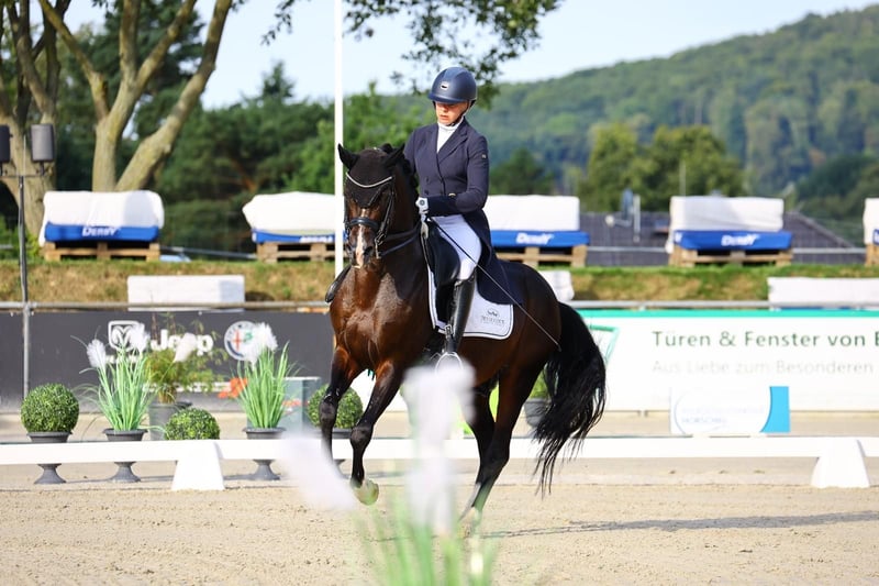 Nancovino E is a very impressive and exceptional German Riding Pony, who always knows how to impress with his three well-developed and distinctly pronounced basic gaits, as well as his appearance and beautiful charisma. In training and at horse performance tests, he is always motivated and cooperative, consistently striving to do everything right. He is easy to ride and is currently being ridden by a 13-year-old girl, presenting himself as a safe and reliable teacher. Nancovino is equipped with good self-confidence and, with appropriate knowledge in handling stallions, shows himself to be a reliable and always manageable partner in daily interactions and while riding. He brings a wealth of competition experience and can boast a variety of placements and victories in dressage up to the S** level and in show jumping up to the A level. This riding pony continually captivates judges and spectators alike and knows how to inspire. As he is very reliable in his lessons and correctly responds to the rider's aids, he is a great sport partner for any talented and empathetic rider. He is also a true pathway to a successful riding career for ambitious, sport-oriented riders. Currently, he is already showing good beginnings for piaffe and passage in training, indicating the real possibility of growing into the tasks of the 'highest class of dressage sport' with appropriate support. We want our very well-trained sport pony, friend, and partner to find a new beautiful home where he will continue to be loved, well-treated, ridden, and developed, so that he can show what he is capable of. Recent X-ray images are available and can be redone if necessary and by arrangement. Numerous videos can be accessed on Clipmyhorse and Rimondo. Additional videos can be sent upon request.