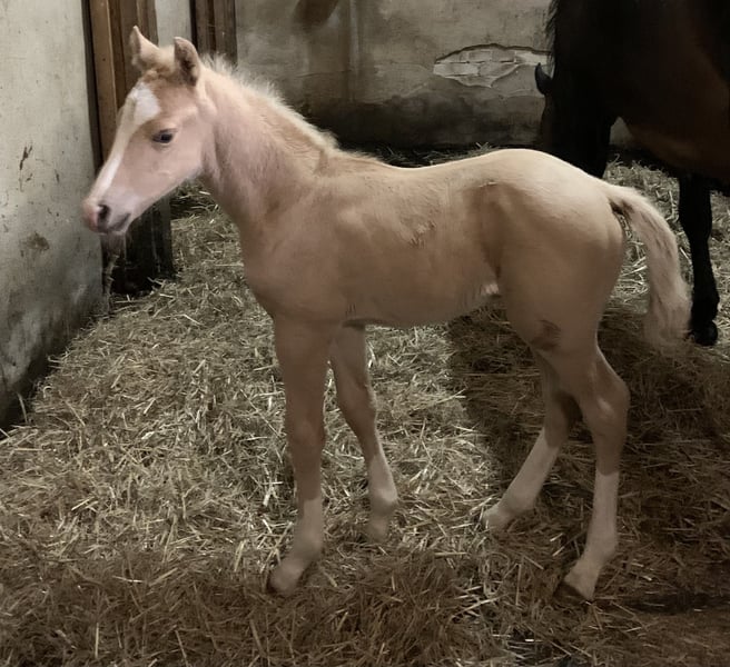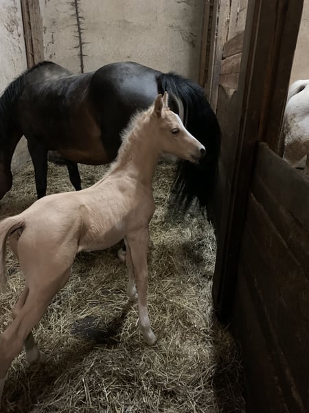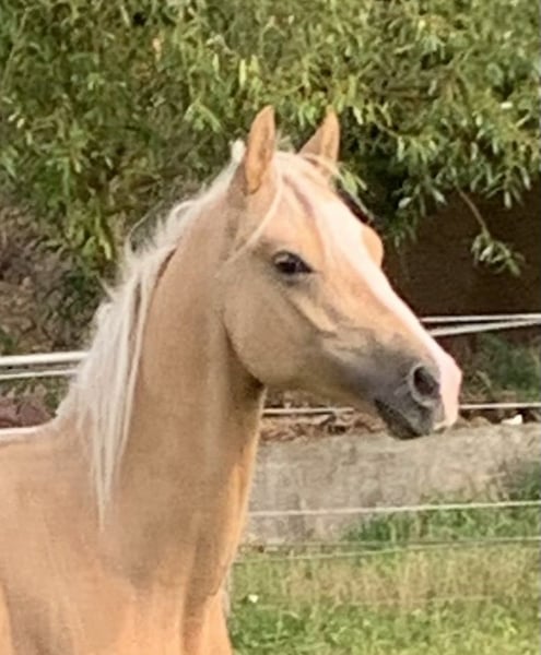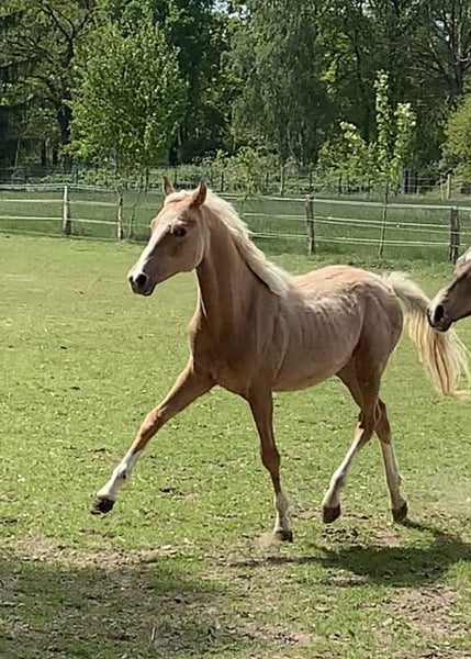 For sale advertisement: German Riding Pony, Stallion, Palomino We are offering a beautiful German Riding Pony stallion for sale. Born in 2024, this magnificent palomino stands out with his impressive appearance and friendly nature. With a height of 148 cm, he is an ideal partner for both youngsters and smaller adults. His golden coat color, typical for Palominos, attracts everyone's attention and makes him stand out in any riding arena. This stallion is not only a visual highlight, but also a real sporting talent. He has been trained in dressage and is already showing promising abilities. His movements are flowing and elegant, his willingness to learn and his concentration make training with him a pleasure. This stallion is a real treasure who is sure to delight his new owner with his lovable nature and dressage potential. He is ready for new challenges and is waiting for a loving home where he can further develop his skills. If you are interested in this fantastic German Riding Pony stallion, please do not hesitate to contact us. We look forward to your inquiry.