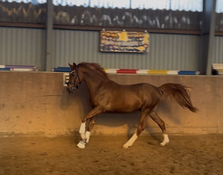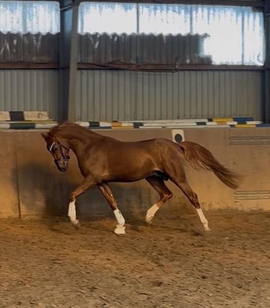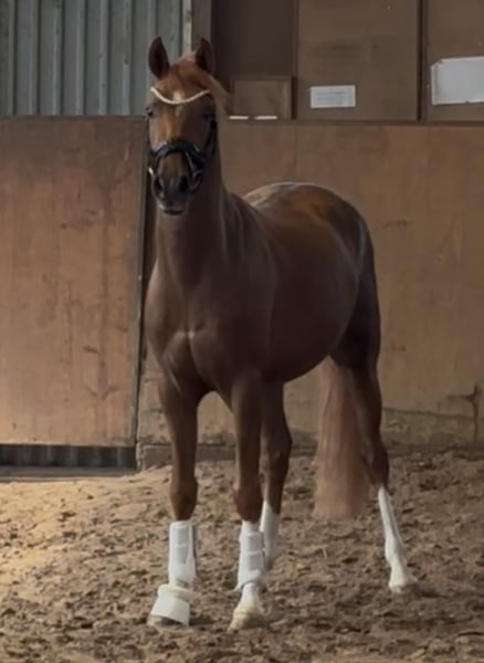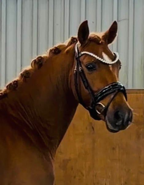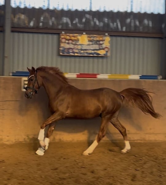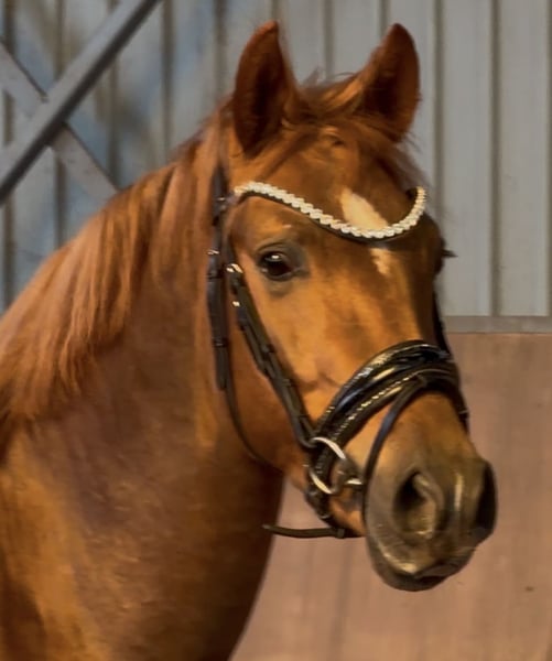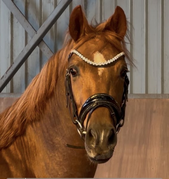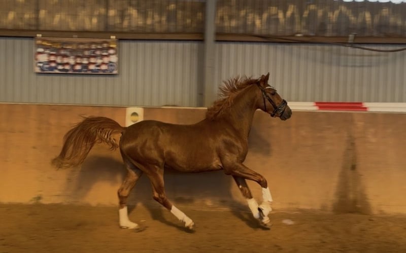 Our pony treasure chest is opening again: Here is a talented young horse with great potential... The stunning chestnut with four white legs is a real eye-catcher. But let him introduce himself to you: Hello, my nickname is "Hans im Glück" (Hans in Luck)... 🍀🍀❤️🍀🍀 Why? My mom, Sjouke, probably sensed I would be her last foal (she is now retired), because she absolutely didn’t want to part with me – and I felt completely at home in her belly. 🥰 My breeder checked on my mom that evening (we were already four weeks overdue...) and inspected the foal’s belly strap from the foal alert. Then she quickly said goodbye to Kiana and her mom, just a few steps from our box in the parking lot. I took the opportunity 😊 and slipped out of the belly into the new world! 🫶 The “old” breeder was quite surprised – less than 10 minutes had passed – and she joyfully called out: “Welcome, little Hans im Glück!” Of course, she recognized I was a colt 😉😃💪, so that’s how I got my name 😅. I grew up at Buchenhof Stud – lovingly cared for by my mom and later in the stallion group with our stand-in dad, Leo, on the Weser in the marshlands. We stayed together even in youth... 🐴 And now, even though we each have our own straw bed and have already learned a lot from our trainer Lennard Heise, we are still close. 🫶 I love cuddling with my buddies – we are very affectionate and like to give kisses. 💕 And I always look forward to “work” time. Lennard says I’m a little overachiever. My trot 🥇 is amazing! My walk and canter also suggest a promising future in dressage. 😇 The path is clear: my mom is an FEI pony, and my dad is even a winner in international FEI competitions – he was, among others, the champion in the dressage championship in Spain (Spanish champion). That’s exactly how I envision my career! 💪🫶 So, if you want me to be part of your family with sporting ambitions, get in touch – I’m excited! 💕 I am now 146 cm tall and can already do circles on the longe line with a saddle, and starting next week, I’ll begin riding. 💪🫶 Oh, and my pedigree: Premium stallion Harry Potter x Sjouke by Elegant Location – Buchenhof Stud, Achim near Bremen And I am a quite dark chestnut with four white legs and the most beautiful eyes – so dark and loyal, I love to look at you with them. 🥰🫶