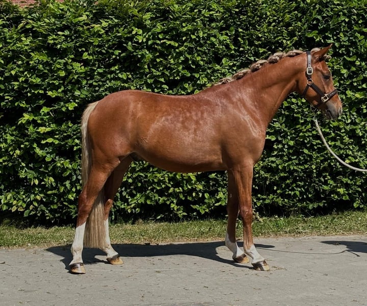 Te koop staat een prachtige driejarige ponyhengst van FS New Chance x Der Feine Lord AT met een stokmaat van 1,47 m. Qua uitstraling is hij echt een blikvanger – vierkant wit, met een expressief en mooi hoofdje en een zeer fraaie lichaamsbouw. Hij beschikt over uitstekende basisgangen en is geschikt voor grotere ruiters. Onder het zadel toont hij zich zeer rijdbaar, fijn te rijden en altijd lief. Hij heeft een prettig basisritme en een fijne aanleuning, waardoor hij al probleemloos door kinderen gereden kan worden. Ook in de omgang is hij een echt betrouwbaar ponytje – vriendelijk, makkelijk in de omgang en kinderlievend. De kleintjes kunnen hem zelfstandig leiden, poetsen en klaar maken. Hij heeft al eens een keer aan een wedstrijd meegedaan, wat hij met vertrouwen heeft gedaan. Daarmee beschikt hij over alles wat je voor de toekomst in de sport, als familiepony of vrijetijdspaardje zou wensen. Röntgenfoto’s zijn aanwezig.