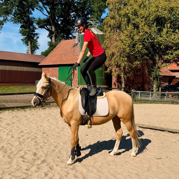 Dieser absolut unerschrockene und charmante Palominowallach hat ein Herz aus Gold und sucht ein neuen Möhrchengeber. Er ist mit sehr guten Grundgangarten ausgestattet, macht auch schon einen kleinen Sprung und geht sogar schon mit seinen 4 Jahren mutig voran ins Gelände. Ein 10-jähriges Mädchen konnte bereits auf ihm Platz nehmen. Allerdings aufgrund des Alters kein reines Kinderpony. Eine gute AKU und ein kompletter TÜV ohne Befunde liegen vor, aufgrund eines Mangels weit unter Wert abzugeben. Platz vor Preis. Er hat echt eine Seele aus Gold