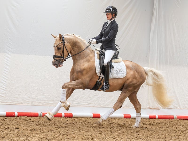 Licensed in 2024 in Rhineland Dance to the Beat impressed the licensing commission at the Rhineland licensing event with his exceptional charm and charisma. The beautiful palomino consistently showcases outstanding form in all three basic gaits. Particularly in the trot, he captivates with great impulsion and leverage, while in the walk, he stands out with a very good overtrack and unwavering rhythm. His canter, always uphill and powerfully executed, impressively underscores his high quality. His sire, Dreidimensional AT NRW, boasts an impressive career. He not only won numerous riding horse tests but also claimed the Westphalia Championship in 2012 and 2013 with top scores. At the 2013 Bundeschampionat, he secured the bronze medal in the finals. In 2014, he was crowned Bundeschampion of the five-year-old dressage ponies and was highly successful up to M-level dressage horse tests. The offspring of Dreidimensional AT NRW have also achieved remarkable successes, including several champion stallions, Bundeschampions, and FEI-successful riding ponies. With D-Gold AT NRW (2018), Dreamtime AT (2016), and Dreiklang AT (2015), he managed to produce the champion stallion in the Hanover breeding area three times within four breeding years. The dam of Dance to the Beat, Verb.Pr.St. Coco Fleur, is by FS Coco Jambo x Power Boy and is the half-sister of the dam of the famous sire FS Champion de Luxe. From the pairing with Dreidimensional AT NRW, she also produced Dance to the Beat's one-year-older full brother, Don Fleur, who was awarded as a premium stallion at the Ponyforum Stallion Days in 2023. Additionally, Coco Fleur has already produced several riding ponies that have been successful in sports with children. Dance to the Beat: A beautifully shaped, movement-strong youngster from the direct dam line of FS Champion de Luxe.