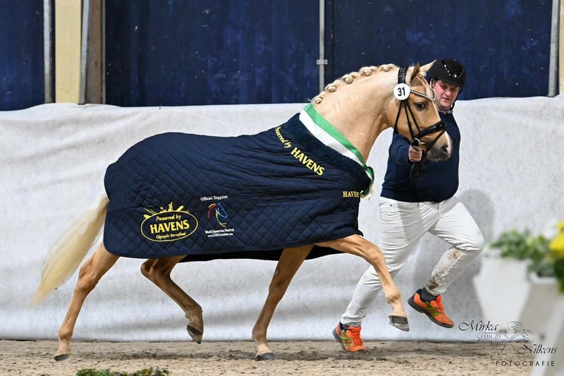 El joven de oro AT, un joven fantástico que no deja nada que desear. Con un tipo perfecto, una conformación correcta, una calidad de movimiento excepcional y un interior de primera clase, impresionó no solo al comité de licencias sino también al público en general en las licencias de Renania y se convirtió en el célebre Campeón de Sementales de las Licencias de Invierno de Renania 2023. Es la viva imagen de su padre D-Gold AT NRW y le hace honor no solo en términos de apariencia sino también en sus primeros pasos con la silla. El padre D-Gold AT NRW, campeón de sementales y doble campeón de Alemania (tres y cinco años), también demuestra su calidad de semental en su segundo año de licencia. Ya ha producido cuatro sementales campeones de sus dos primeras cosechas, Dorfrocker RB (licencia del sur de Alemania 2022), Damenstolz A (licencia ZfdP primavera 2023), NN por D-Gold AT NRW (campeón de salto Neustadt-Dosse 2023) y ahora con Der Goldjunge AT en Renania 2023. Las hijas de D-Gold AT NRW también lograron grandes éxitos con yeguas el año pasado. Debutante AT fue yegua campeona en Westfalia y vicecampeona de Westfalia. D-Wonder AT obtuvo el tercer puesto en el Campeonato de Yeguas de Élite en Lienen. La madre Cupcake por Chronospace WE x FS Don't Worry produjo su primera yegua de prima estatal y yegua final de ring en el Rhineland Elite Mare Show 2023 con Duchess, la hermana completa de Der Goldjunge AT, que es un año mayor. El padre de la madre, Chronospace WE, fue a su vez semental premium en la Westphalian Riding Pony Licensing 2013 en Münster-Handorf. En el deporte, se clasificó en pruebas de nivel avanzado y más tarde en pruebas de doma FEI. La abuela Dakota B por FS Don't Worry x Domingo es la madre de tres sementales con licencia y cuatro yeguas premium estatales, incluyendo Capina Mia (madre de los sementales con licencia Der Classicer AT (por Dimension AT NRW), el semental campeón Dreiklang AT (por Dreidimensional AT NRW), Del Classico (por D-Day AT) y el campeón de salto Despacito AT (por D-Day AT)). Goldjunge AT se remonta a la exitosa línea de la yegua westfaliana Desiree tanto por parte de padre como de madre. EL GOLDJUNGE AT Joven semental inteligente y bien desarrollado que es la viva imagen de su padre D-Gold AT NRW.