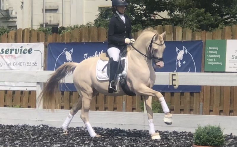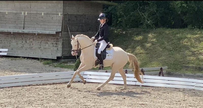Cashcode ist ein Sohn des Caramel WE ,Siegerhengst Landeschampion und Bundeschampion - seine Mutter Carla eine Tochter des FS Champion de Luxe x FS Don’t Worry aus einem hochdekoriertem Stutenstamm ,dem auch zahlreiche international erfolgreiche und prämierte Sportponys entspringen. Cashcode wurde auf der Körung des Ponyforum gekört und ist bundesweit anerkannt. 2021 siegte er in Reitpferdeprüfungen gegen Großpferde- für die Rittigkeit erhielt er die 9,0 2021 platzierte er sich im Finale des Westfalenchampionates -Teilnahme Bundeschampionat HLP -in Münster Handorf mit der besten Rittigkeitsnote aller Teilnehmer - er wird Leistungshengst 2022 Erfolge in Dressurprüfungen Kl.A und Qualifikation zum HKM Bundeschampionat 2023 Auf der Bundeshengstschau der Deutschen Reitponys in Berlin wurde er mit einem 1 d Preis ausgezeichnet und konnte sich als bester Westfälischer Ponyhengst in seiner Altersklasse im Dressurwettbewerb platzieren. Cashcode gewinnt 2023 zwei Finalqualifikationen zum HKM Bundeschampionat des 6 jährigen Dressurponys . Auch gegen Grosspferde platzierte sich Cashcode in Dressurprüfungen der Klasse L. Die erste FEI Platzierung untermauerte seine Erfolge -auch hier war es Kiana Joy Hoyer die seit 2022 im Sattel des charmanten Perlinos sitzt ,und diese Erfolge möglich machte. Im Jahr 2024 erzielte das Paar zahlreiche Erfolge in der Klasse L. Seit vier Jahren deckt Cashcode und ist auch 2025 über das Landgestüt Celle über Frischsamen verfügbar. Seine Fohlen sind nicht nur wunderschön ,sondern auch sehr bewegungsstark.Seine ersten Nachkommen sind nun unter dem Sattel und unsere Erwartungen sind vollends erfüllt worden-die Rittigkeit seiner Kinder ist beispielhaft bei allerbesten Interieurwerten-echte Traumponys. Cashcode vererbt sich sehr konstant bei stets korrektem Fundament, toller Farbvielfalt und herrlicher Typausprägung. Cashcode ist auch für die Warmblutzucht zugelassen und wird auch häufig für Warmblutstuten eingesetzt ,die Fohlen sind ausnahmslos sehr gelungen. Cashcode war auch 2024 sehr gefragt und seine Fohlen begehrt. Cashcode besitzt das doppelte Creme Gen ,hat bisher aber noch keine Nachkommen mit blauen Augen gebracht. Die Farben sind über Palomino ,Buckskin und Falben mit schönen Abzeichen in herrlicher Aufmachung vertreten. Seine Bewegungsgüte und sein Springvermögen machen ihn zu einem doppelt veranlagten VERERBER mit dem gewissen Extra. 2025 platzierte sich Cashcode in der Klasse M mit Kiana ❣️ Samenbestellungen über das Landgestüt Celle -Besamumgsstation Verden oder Frau Susann Heise