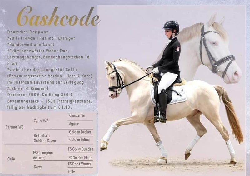 Cashcode is een zoon van Caramel WE, kampioenshengst van de deelstaat en Bundeschampion - zijn moeder Carla is een dochter van FS Champion de Luxe x FS Don’t Worry uit een hooggewaardeerd merriestam, waaruit ook talrijke internationaal succesvolle en bekroonde sportpony's voortkomen. Cashcode werd goedgekeurd op de keuring van het Ponyforum en is landelijk erkend. In 2021 won hij in rijpaardproeven tegen grote paarden - voor zijn rijdbaarheid ontving hij een 9,0. In 2021 plaatste hij zich in de finale van het Westfalenkampioenschap - deelname aan het Bundeschampionat HLP - in Münster Handorf met de beste rijdbaarheidsscore van alle deelnemers - hij wordt prestatiehengst. In 2022 behaalde hij successen in dressuurproeven klasse A en kwalificatie voor het HKM Bundeschampionat. In 2023 Op de Bundeshengstschau van de Duitse rijpony's in Berlijn werd hij onderscheiden met een 1d prijs en kon hij zich als beste Westfaalse ponyhengst in zijn leeftijdsklasse plaatsen in de dressuurwedstrijd. Cashcode wint in 2023 twee finale kwalificaties voor het HKM Bundeschampionat van de 6-jarige dressuurpony's. Ook tegen grote paarden plaatste Cashcode zich in dressuurproeven van klasse L. De eerste FEI plaatsing onderstreepte zijn successen - ook hier was het Kiana Joy Hoyer die sinds 2022 in het zadel van de charmante Perlinos zit en deze successen mogelijk maakte. In 2024 behaalde het paar talrijke successen in klasse L. Cashcode dekt al vier jaar en is ook in 2025 beschikbaar via het Landgestüt Celle met vers sperma. Zijn veulens zijn niet alleen prachtig, maar ook zeer bewegingssterk. Zijn eerste nakomelingen zijn nu onder het zadel en onze verwachtingen zijn volledig vervuld - de rijdbaarheid van zijn kinderen is voorbeeldig met de allerbeste interieurwaarden - echte droompony's. Cashcode vererft zeer consistent met altijd een correcte bouw, geweldige kleurvariëteit en prachtige typologie. Cashcode is ook goedgekeurd voor de warmbloedfokkerij en wordt vaak ingezet voor warmbloedmerries, de veulens zijn stuk voor stuk zeer geslaagd. Cashcode was ook in 2024 zeer gewild en zijn veulens zijn gewild. Cashcode heeft het dubbele crème-gen, heeft tot nu toe echter nog geen nakomelingen met blauwe ogen voortgebracht. De kleuren zijn vertegenwoordigd in palomino, buckskin en falben met mooie aftekeningen in prachtige opmaak. Zijn bewegingskwaliteit en springvermogen maken hem tot een dubbel getalenteerde VERERBER met dat beetje extra. Sperma bestellingen via het Landgestüt Celle - dekstation Verden of mevrouw Susann Heise.