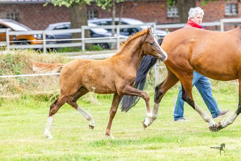 **Sales Advertisement: German Riding Pony Stallion** For sale is a promising German Riding Pony stallion, born in 2025. With an estimated final height of 148 cm and his striking chestnut color, he attracts all attention. This talented stallion is well-suited for dressage. He has harmonious movement and a pleasant temperament, making him an ideal partner for ambitious riders. He is well-mannered, easy to handle, and has a friendly disposition. Whether for leisure or competition, this stallion offers many opportunities and will surely bring a lot of joy. If you are interested or have any further questions, please feel free to contact me. Viewings can be arranged by appointment. Don't miss this chance!