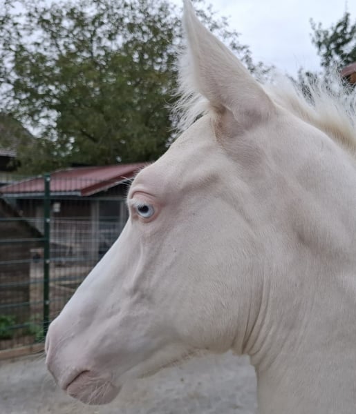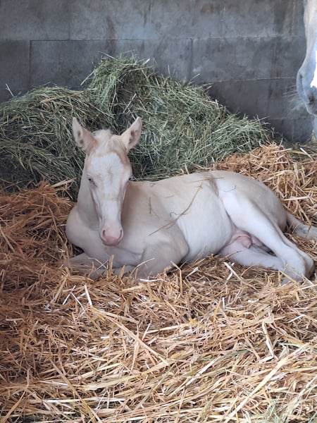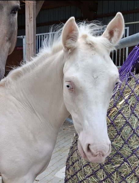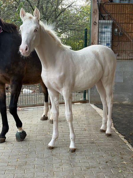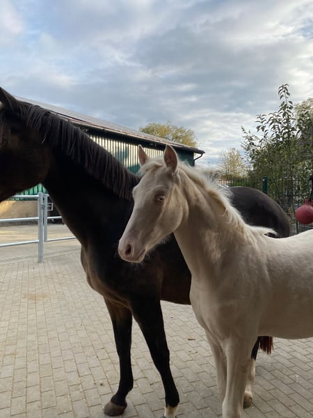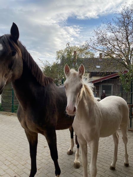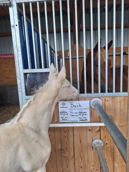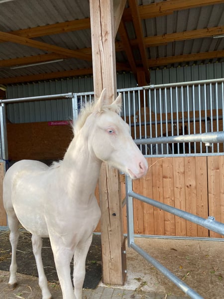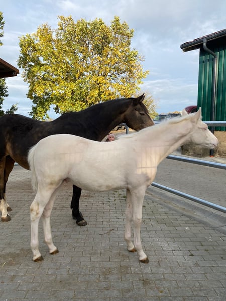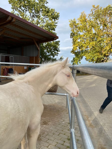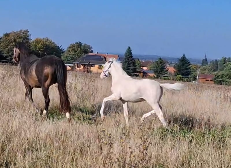 Wird höchstwahrscheinlich XXL Pony, Mutter auch deutlich aus dem Maß gewachsen (1,53m), von Geburt an Großrahmiger Typ, Geboren am 22.06.2025 Halbgeschwister sehr erfolgreich im Sport, Sehr Menschenbezogener Typ, mutig und selbstbewusst, Sonderfarbe Cremello, Kann zeitnah abgesetzt werden, Kennt Kinder, Hühner, Hunde, Trecker Videos auf Nachfrage Gechipt, entwurmt